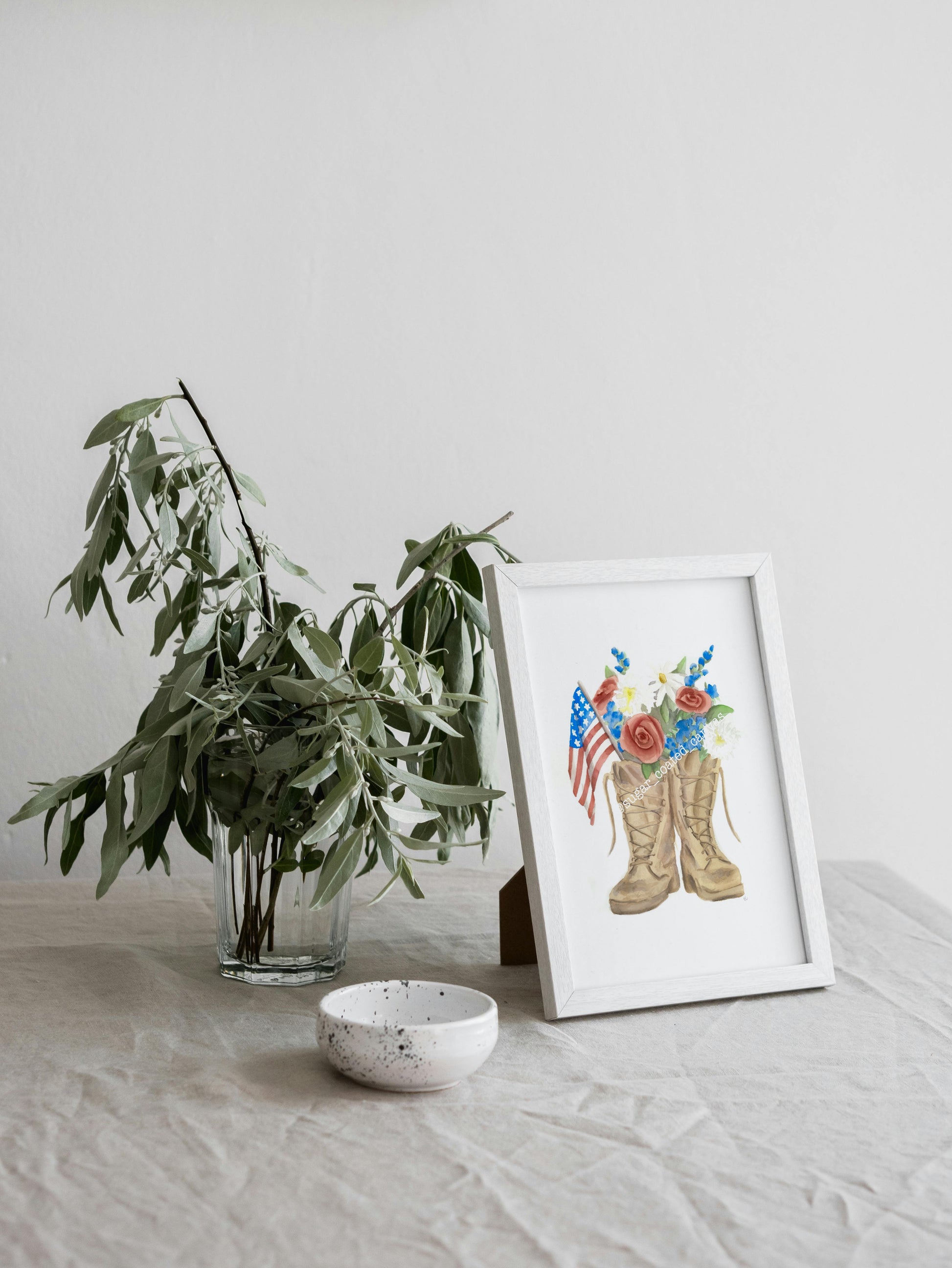 This American Boots Watercolor Print showcases military boots filled with blooming flowers and the stars and stripes of our flag. A touching tribute perfect for Fourth of July celebrations or as a meaningful gift to honor veterans. The delicate watercolor technique captures both the strength of service and the beauty of gratitude in one heartfelt piece of patriotic artwork.