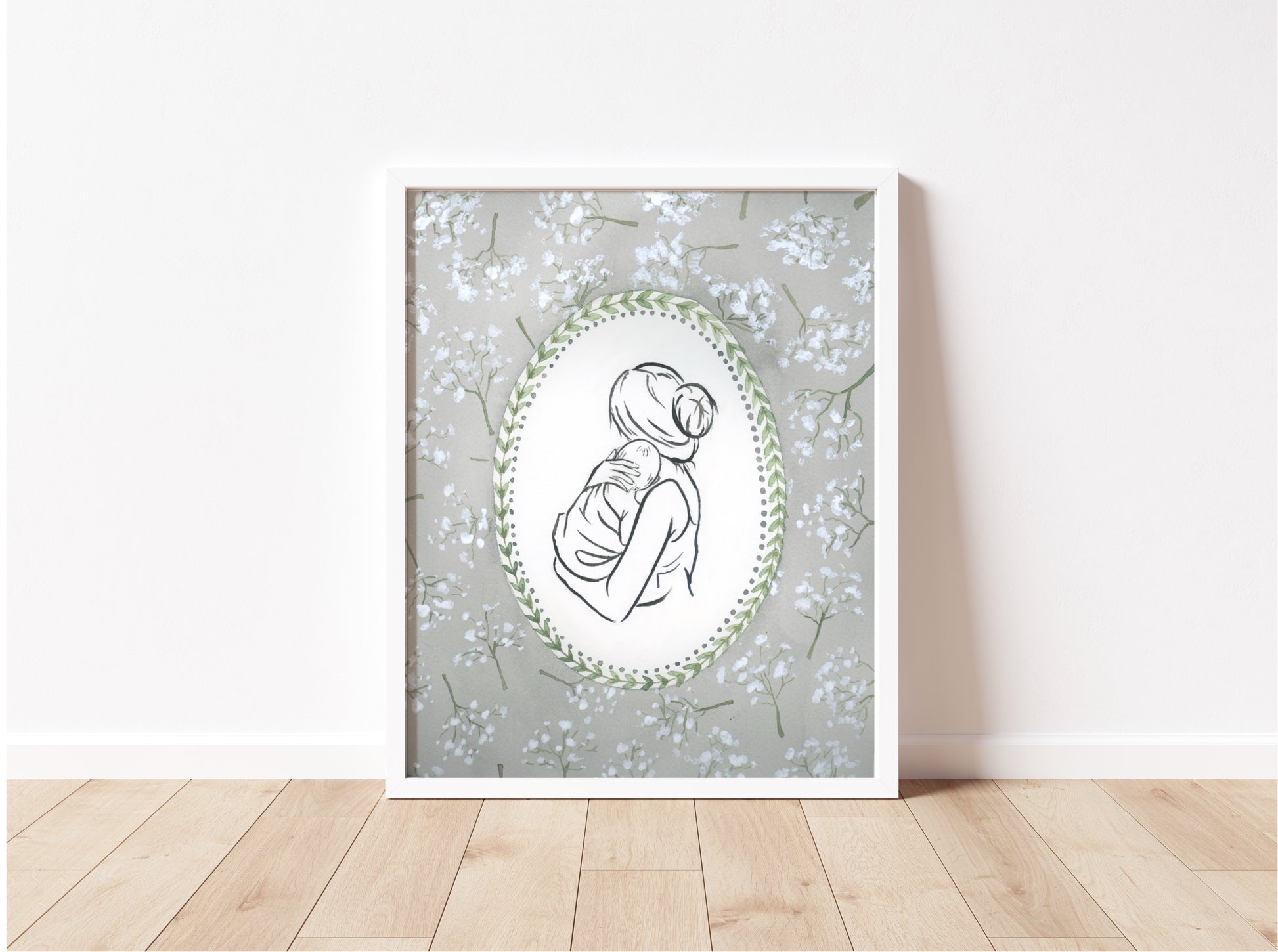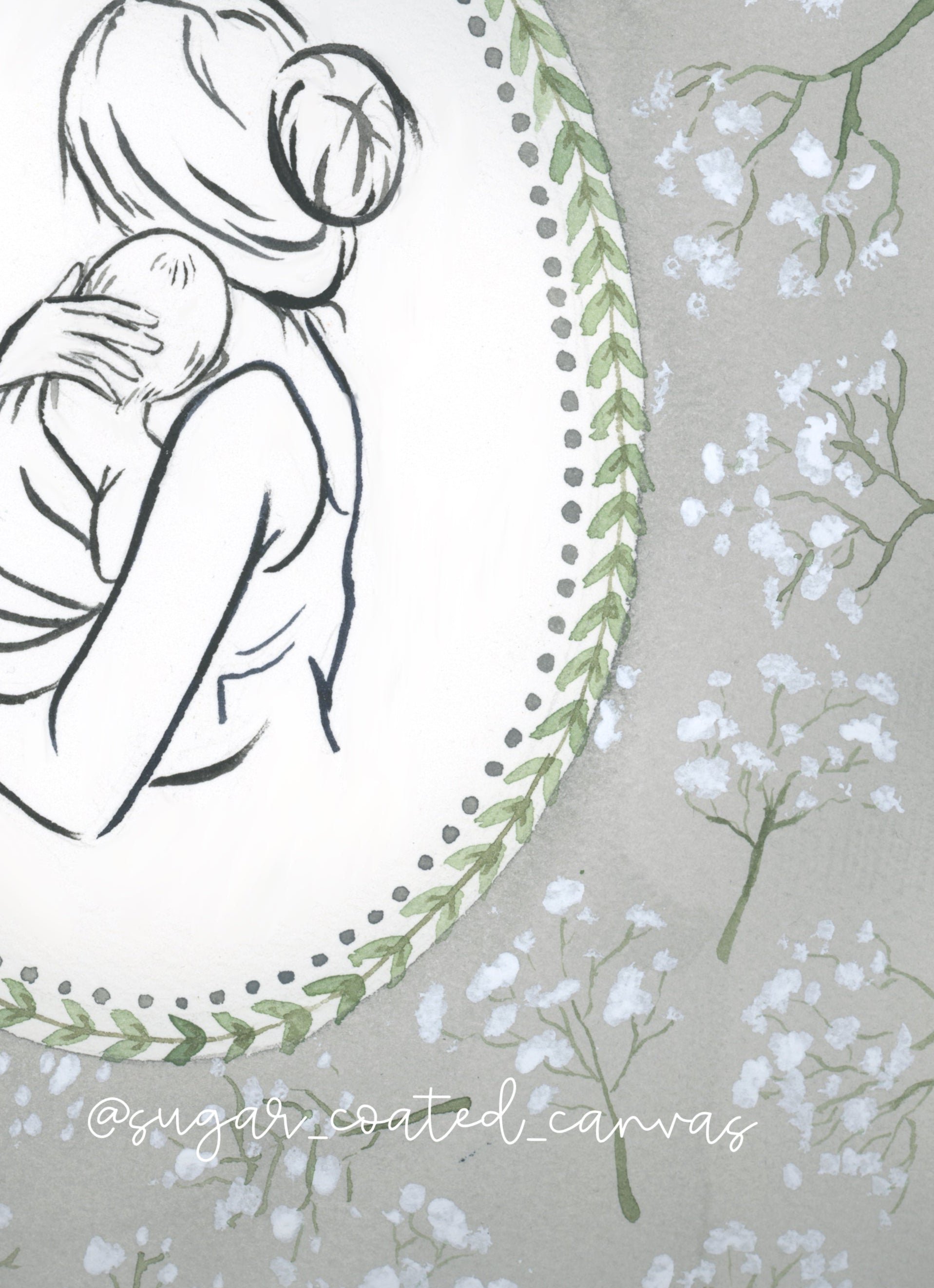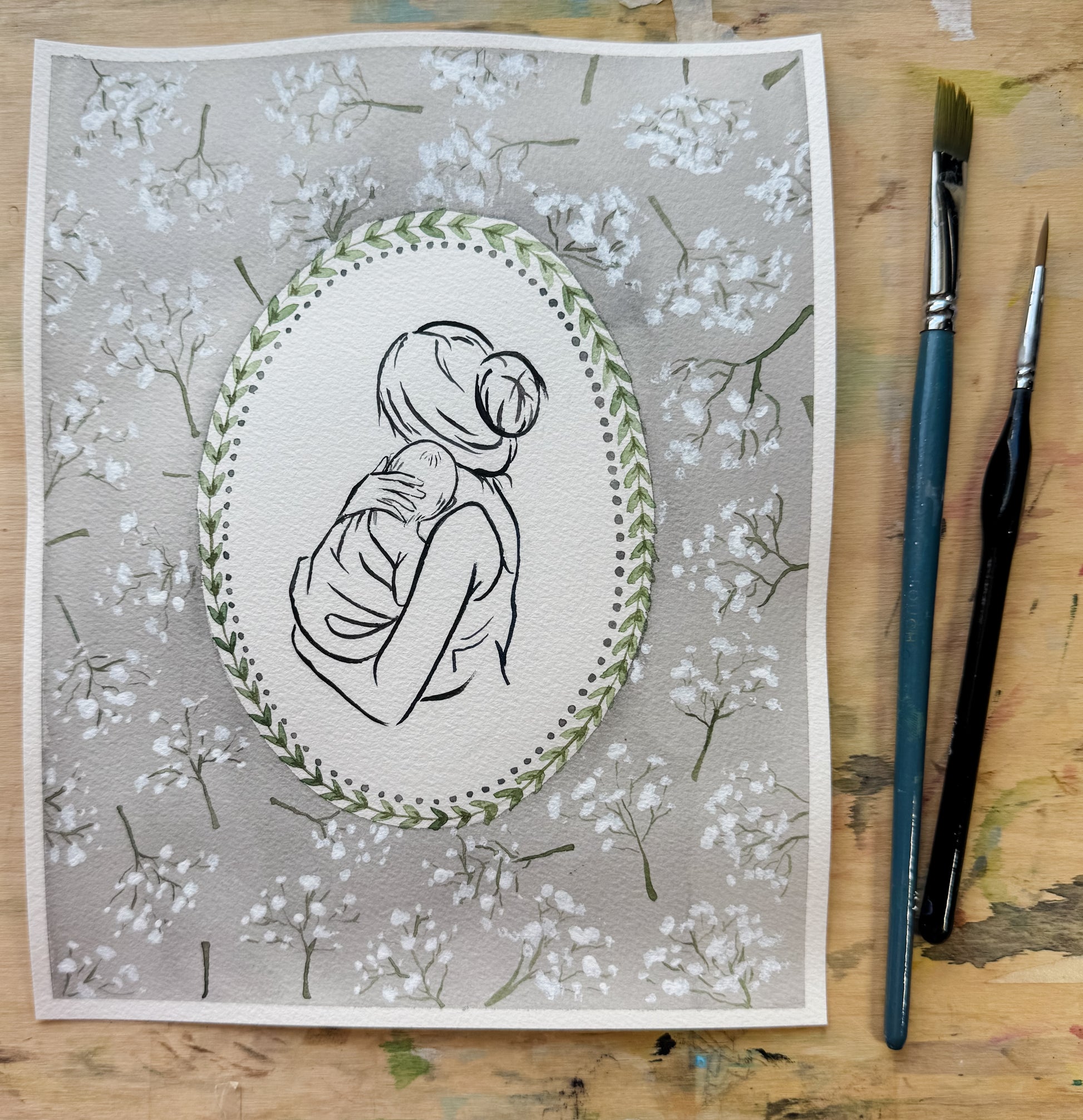 Snuggling my baby is one of my greatest joys. The time when they are small enough — and willing — to snuggle passes so quickly. I created this painting as a reminder of those fleeting, tender moments. Along the borders, I included baby’s breath as a symbol of everlasting love, even though the baby snuggles themselves don’t last forever.