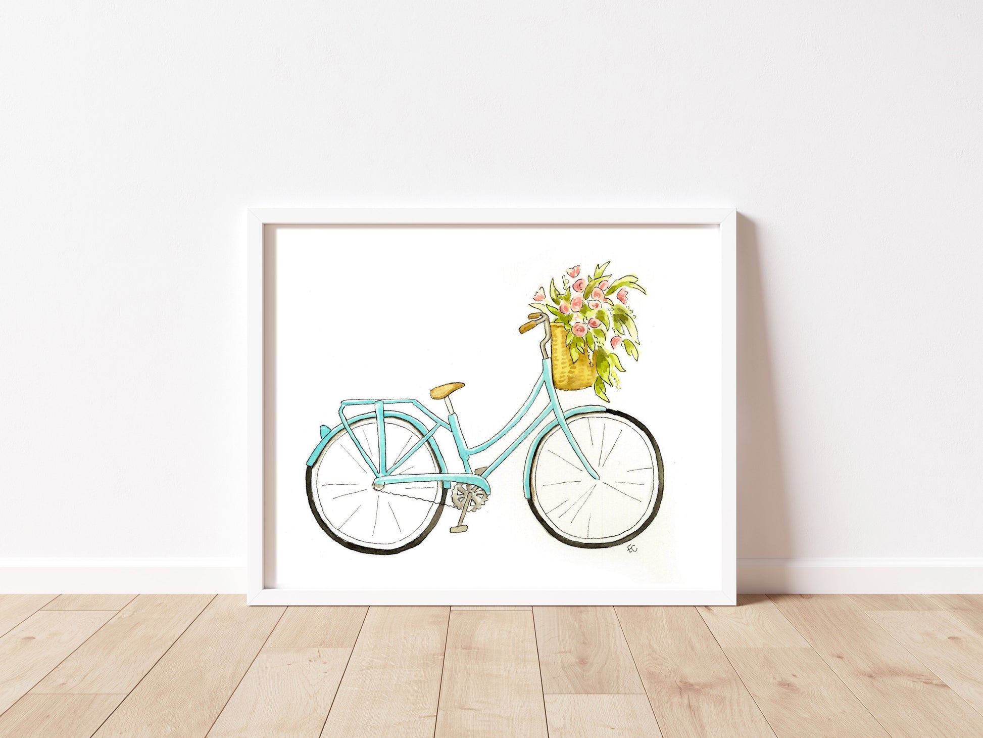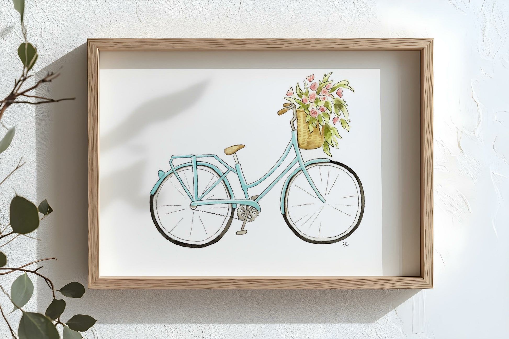 Pedal into whimsy with this charming blue bike watercolor print. Delicately hand-painted with soft brushstrokes, this artwork features a lovely blue bicycle adorned with a basket of colorful blooms. Perfect for adding a touch of joy to any room, this sweet illustration captures the carefree spirit of a sunny day ride.