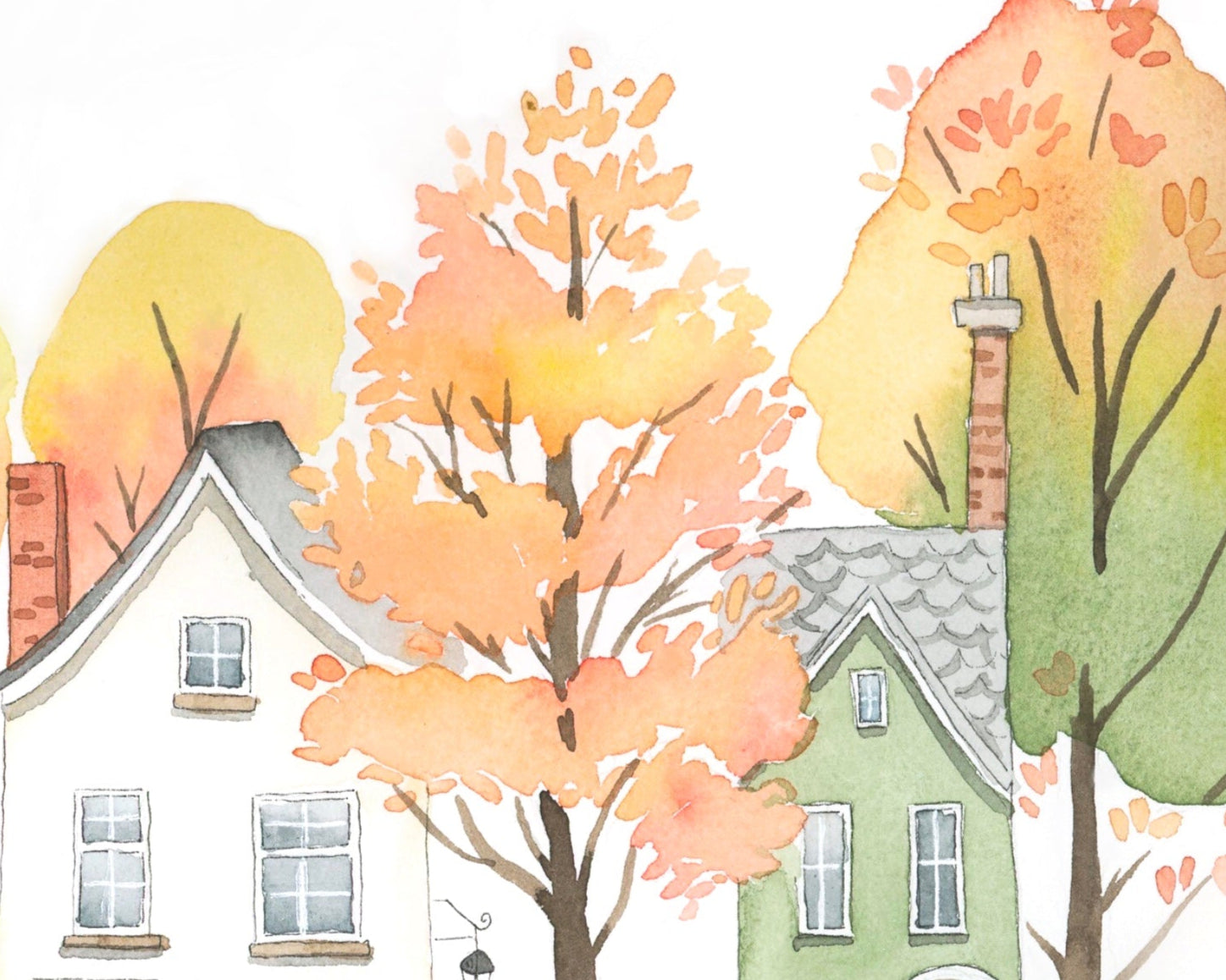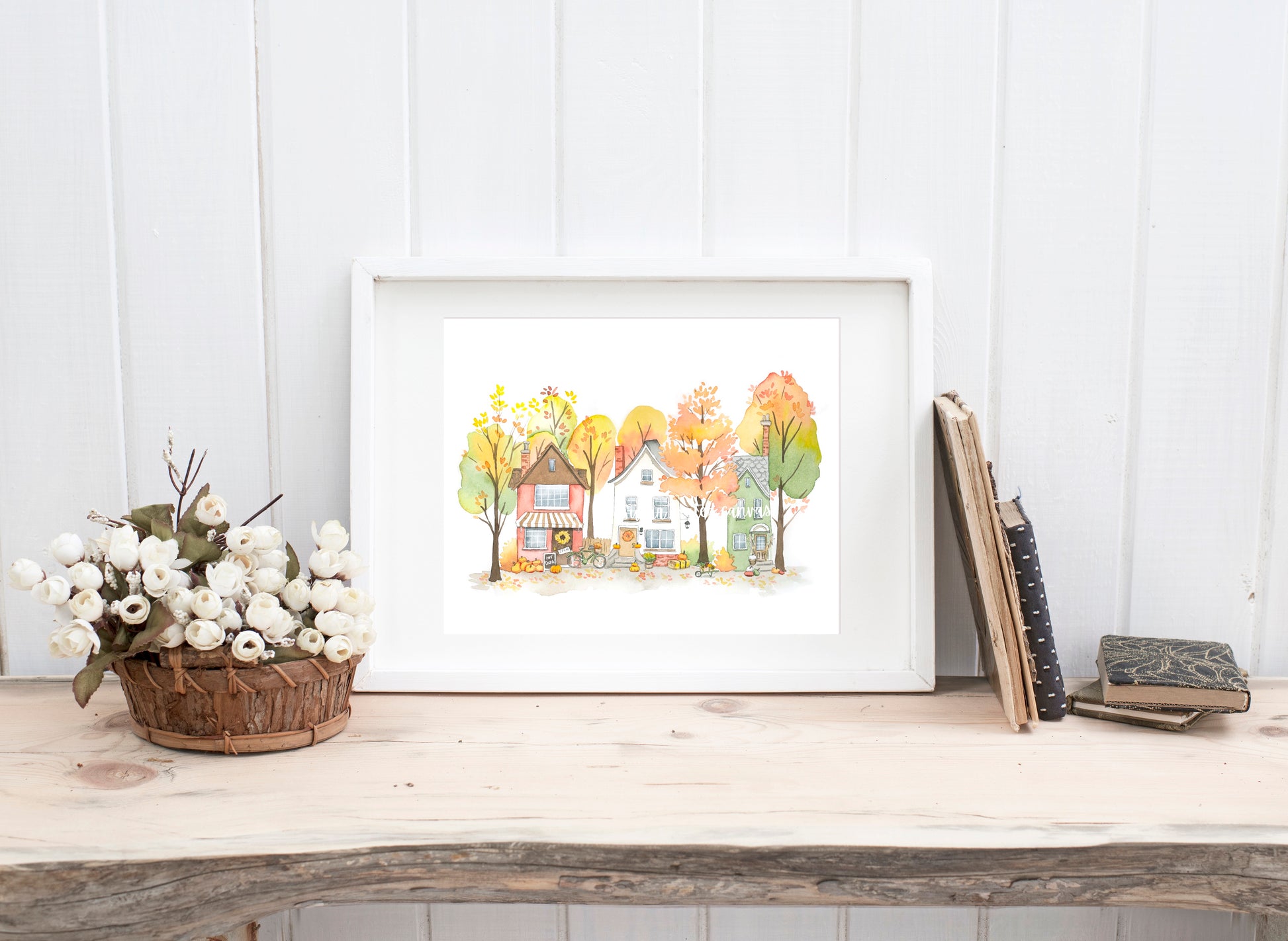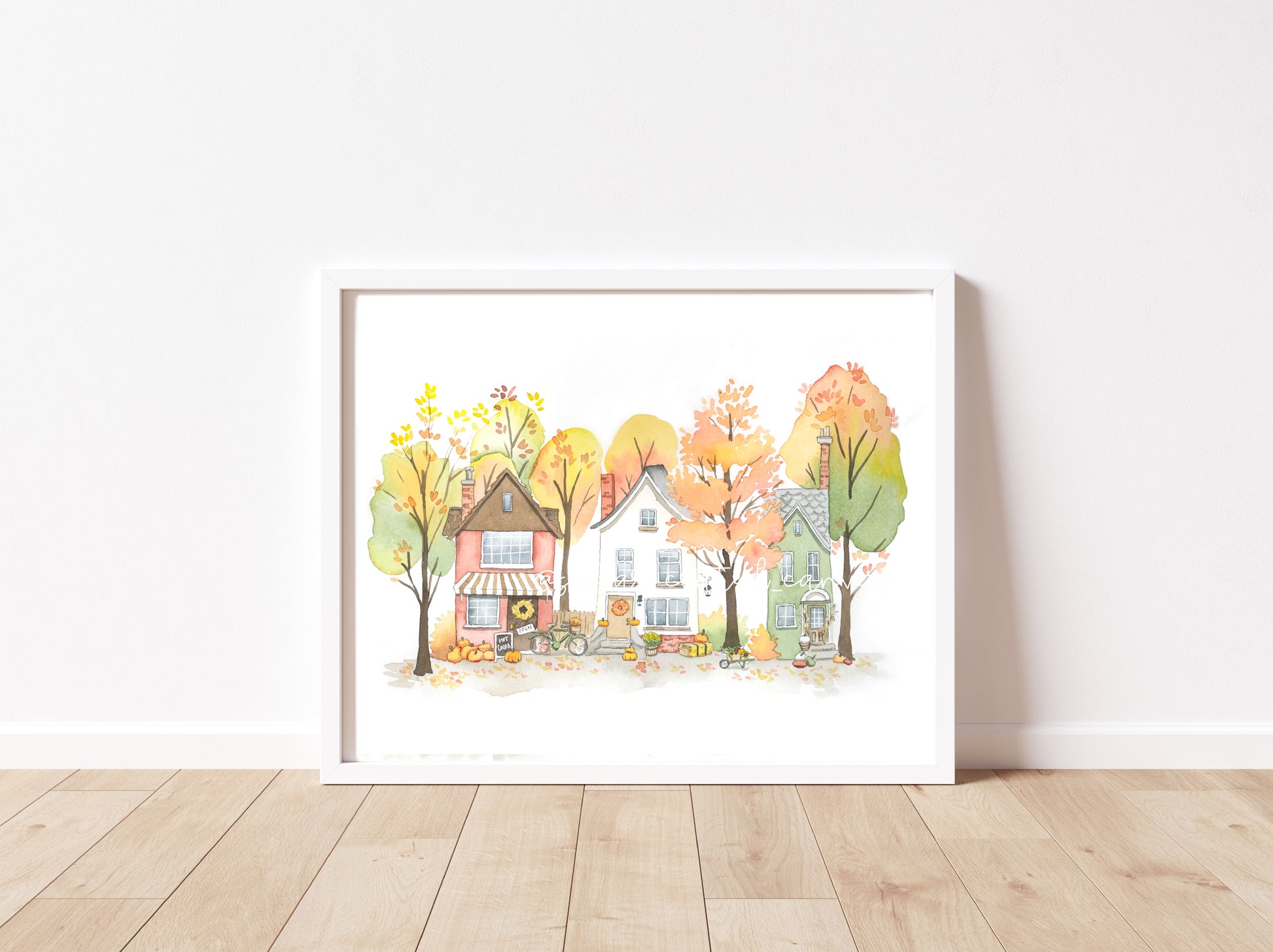 This Cozy Fall Houses Watercolor Print captures a charming street scene filled with warm autumn hues. It brings a sense of comfort and seasonal cheer, making it a perfect addition to brighten up your home with cozy fall vibes.