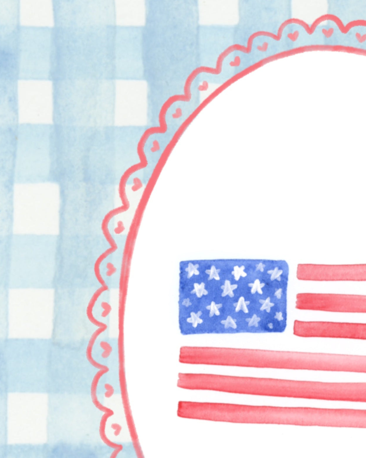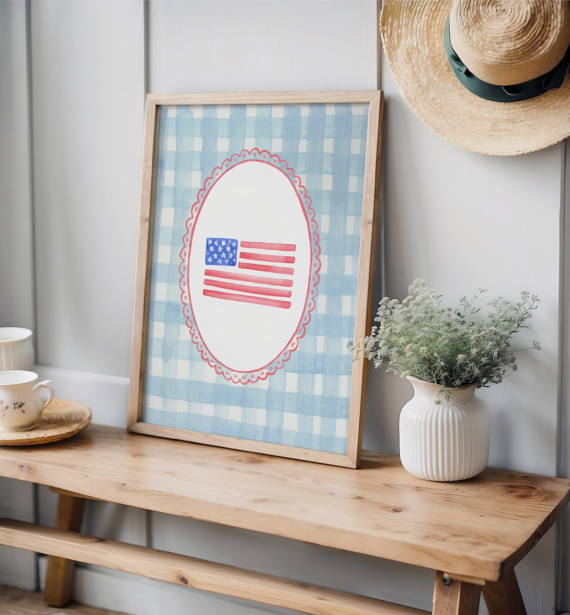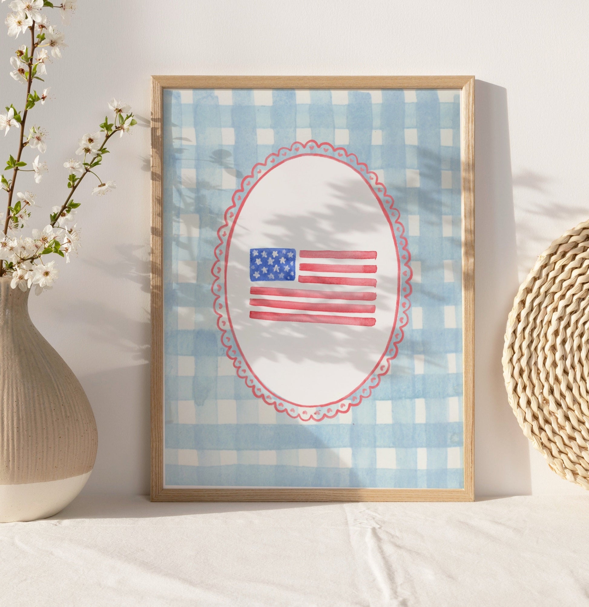 Celebrate Independence Day with this adorable watercolor print featuring the American flag paired with charming gingham patterns. Its playful design adds a festive and cozy touch to your home decor, perfect for bringing a bit of patriotic cheer to any space.