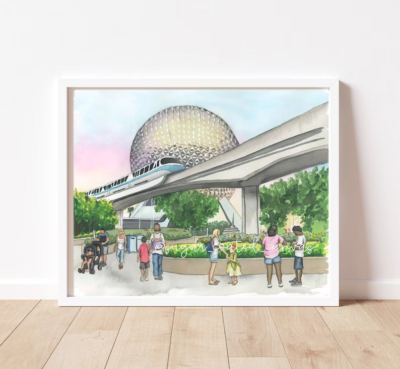 Immerse yourself in the magic of Disney with this beautiful watercolor print of Epcot. Perfect for Disney World fans and lovers, featuring the iconic monorail and spaceship earth. Decorate your space and reminisce about a day at the parks with this charming piece.