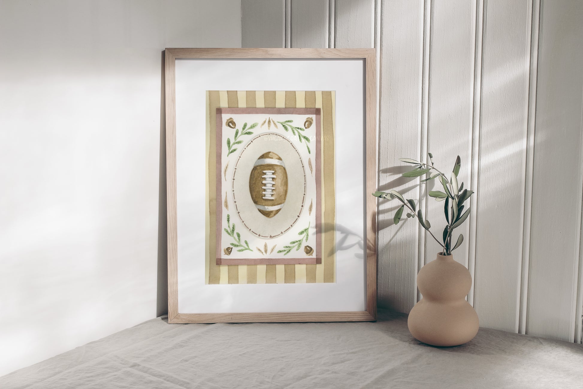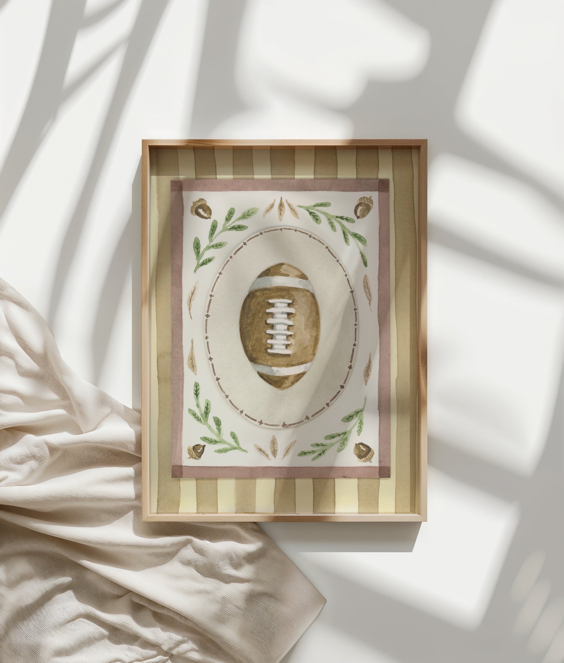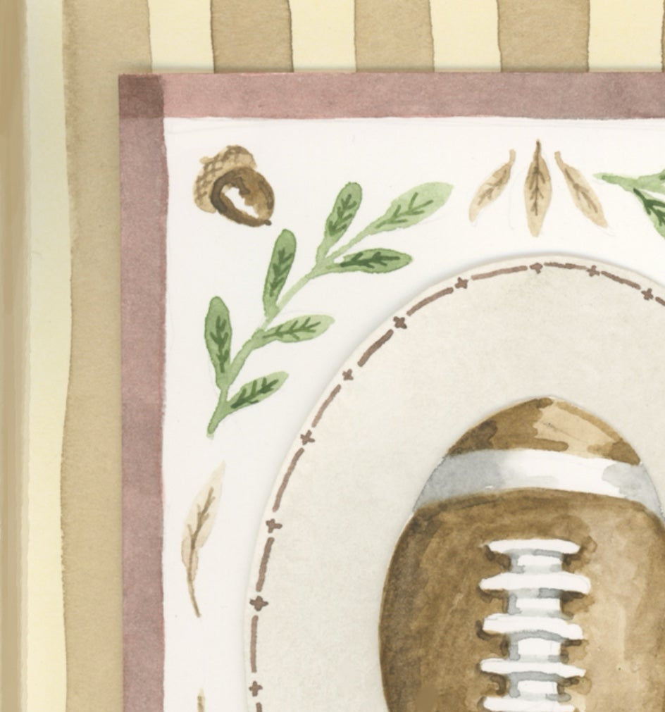Celebrate the spirit of fall with this playful watercolor print featuring a charming football design intertwined with subtle seasonal patterns. Perfect for adding a cozy, sporty touch to your space, this artwork captures the warmth and excitement of autumn game days in a soft, artistic style.