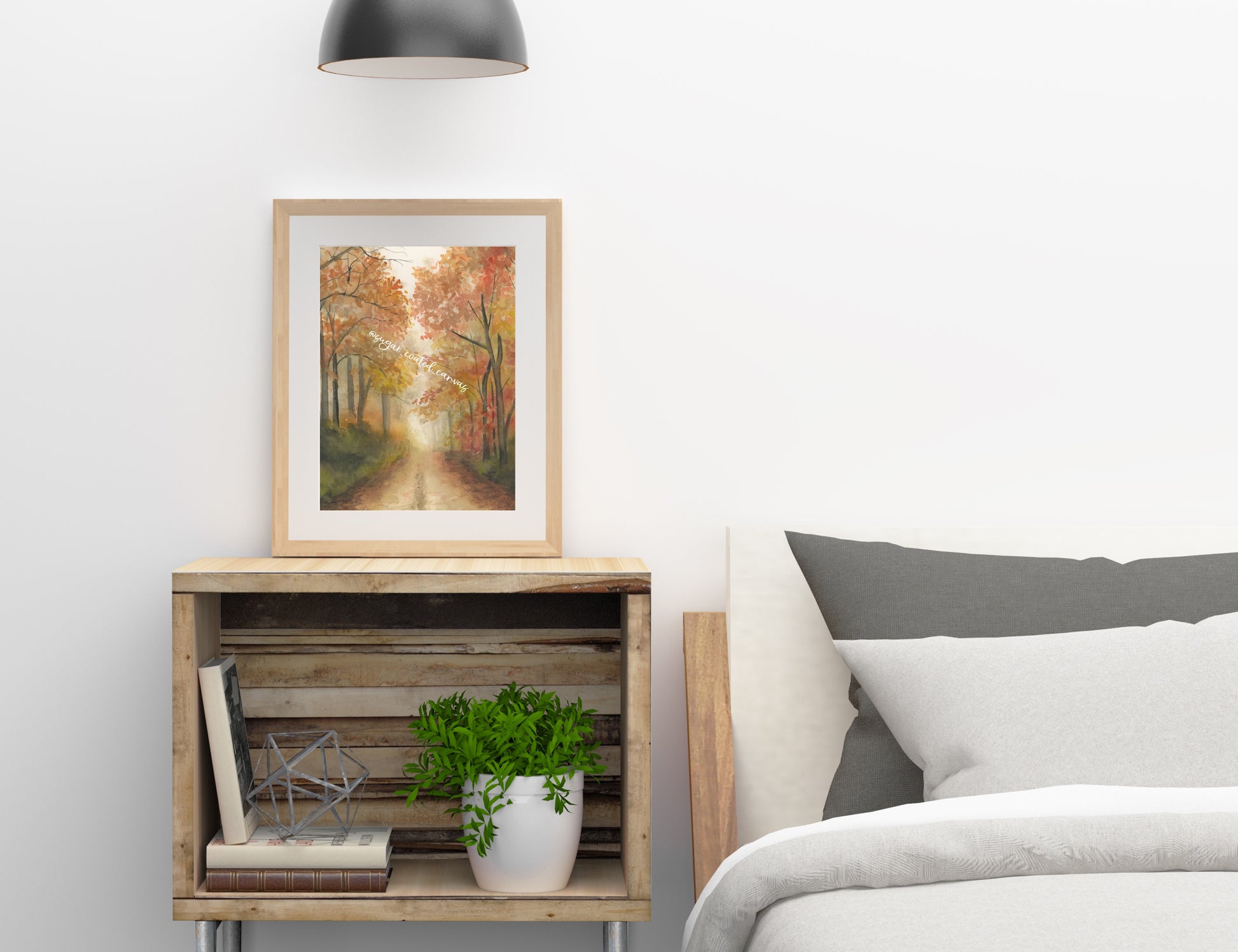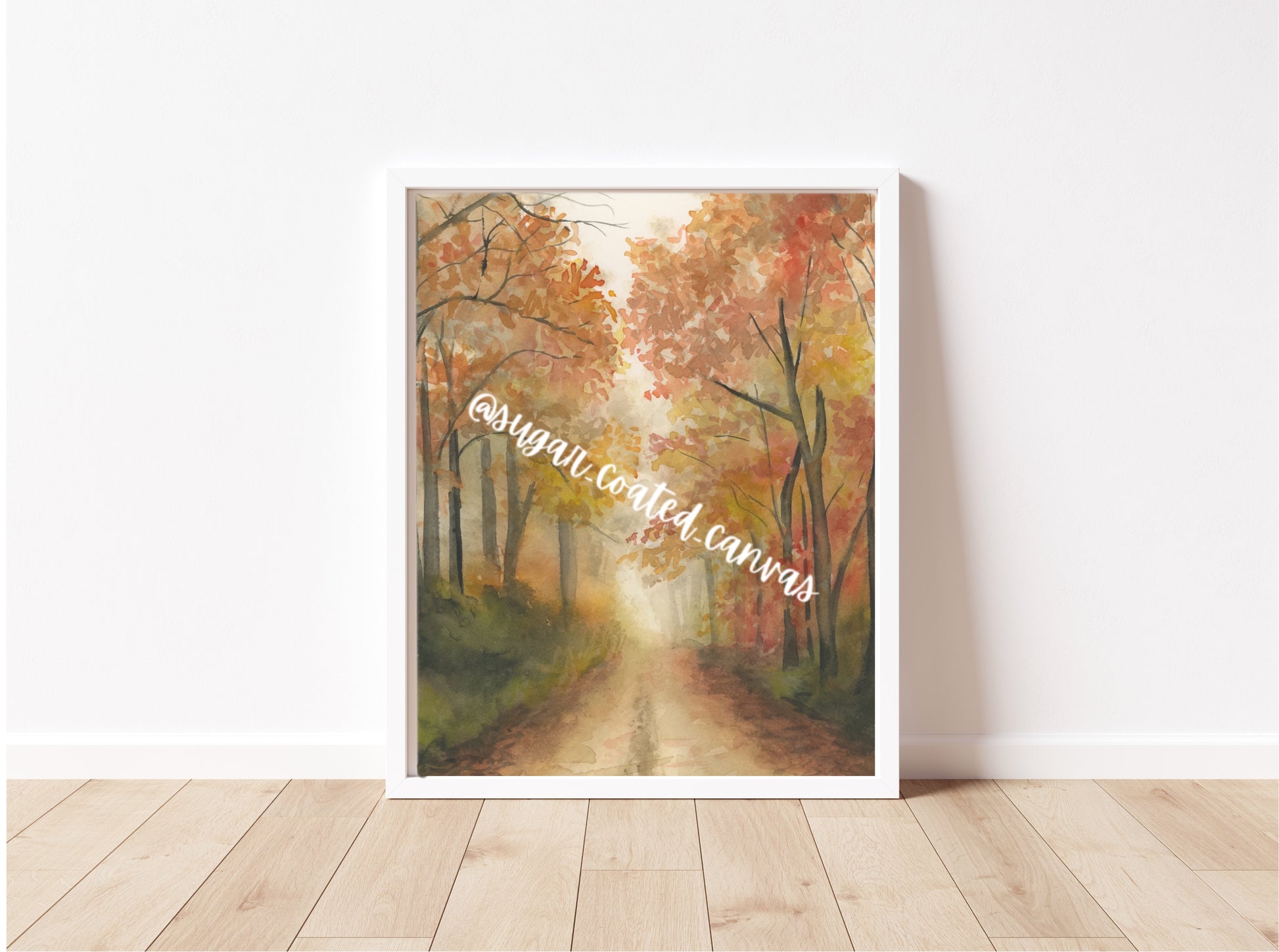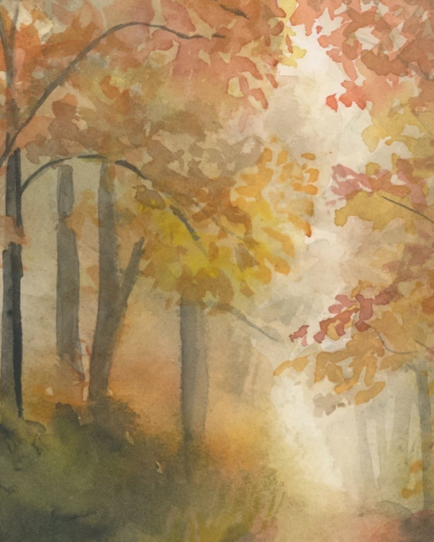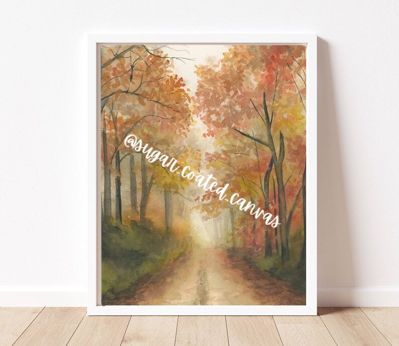 This watercolor painting captures a foggy road blanketed with colorful fall leaves, inviting you to wander through a whimsical autumn scene. Its soft hues and misty atmosphere bring a cozy, magical touch to any room, perfect for celebrating the charm of the season.