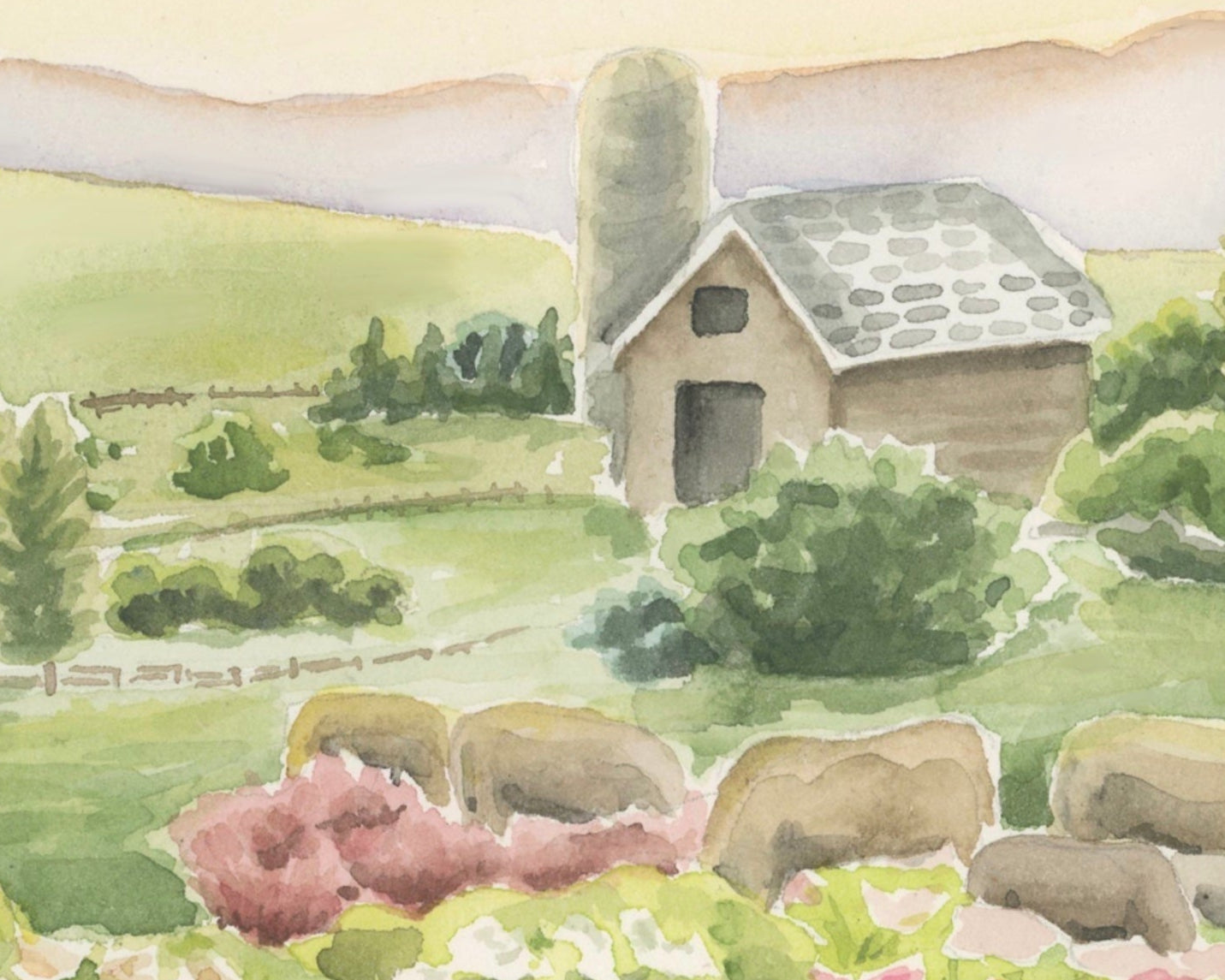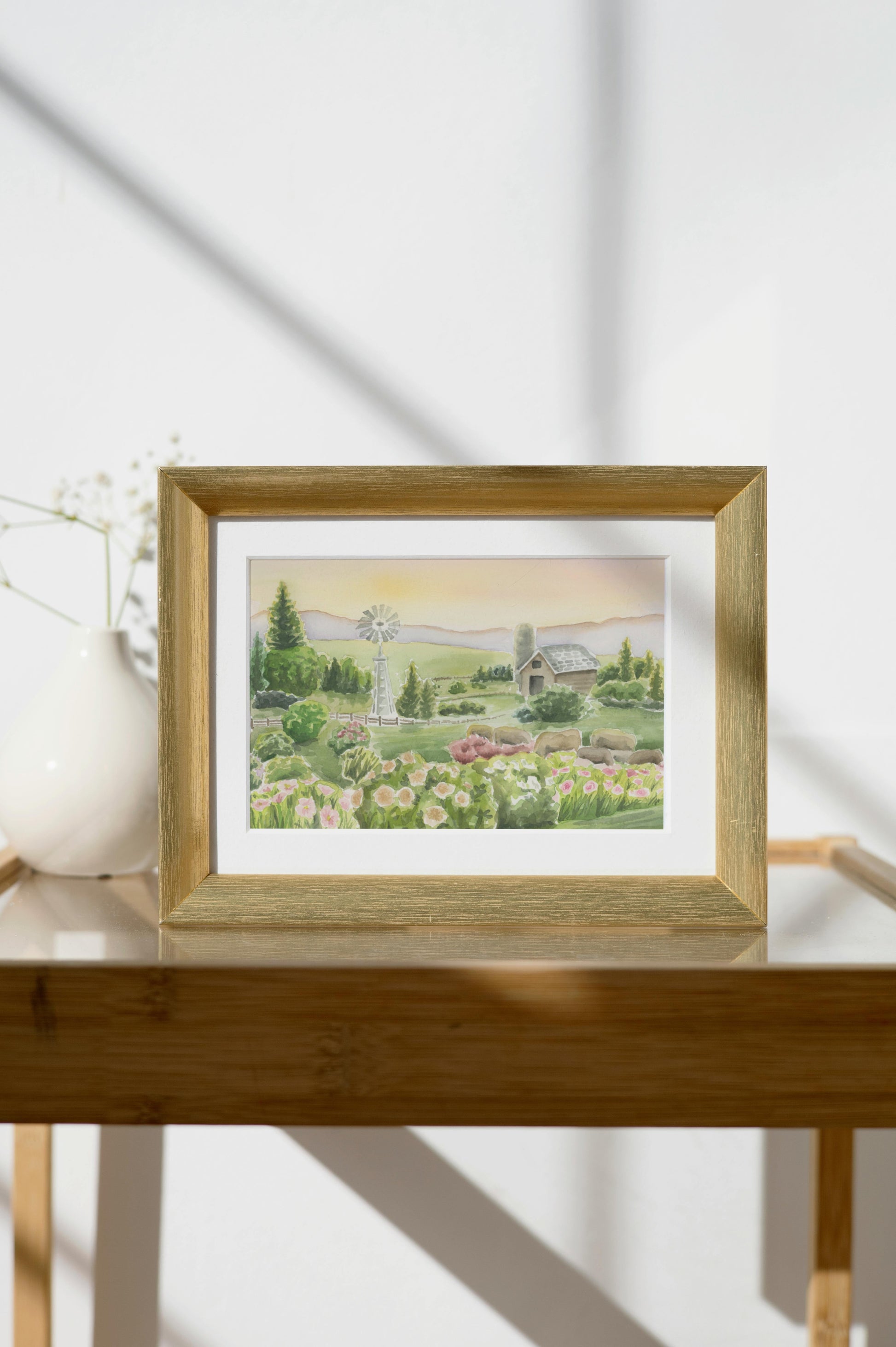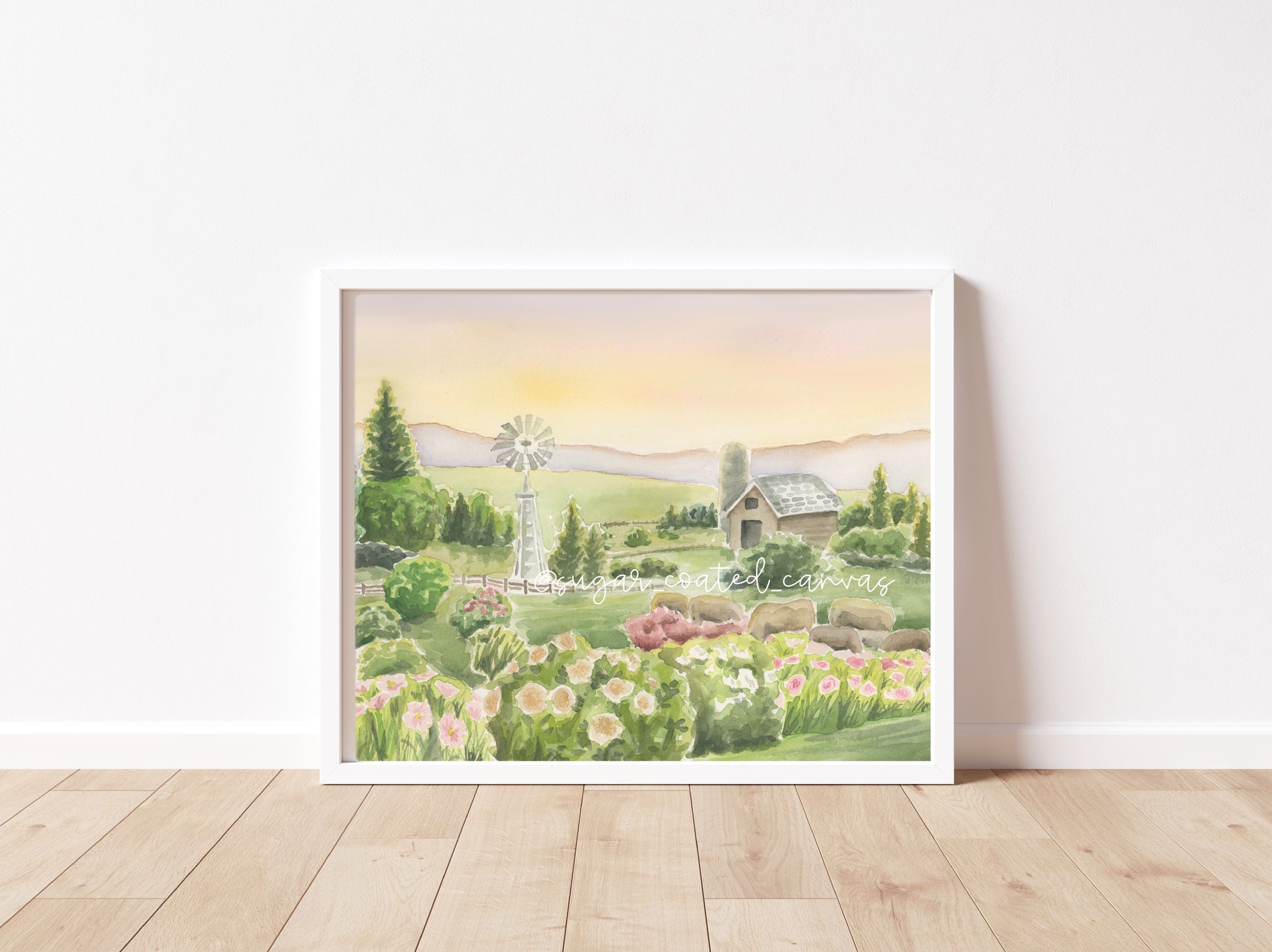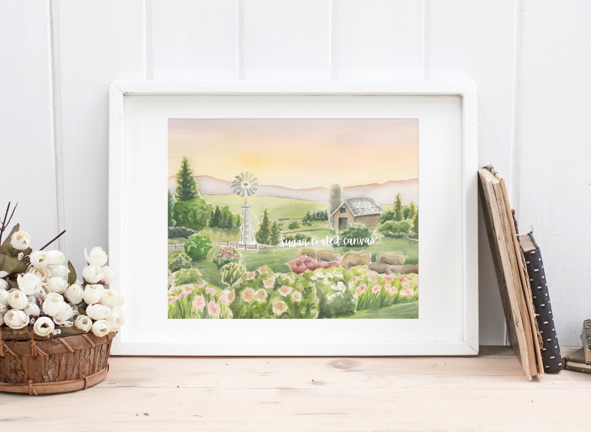 Experience the beauty of the countryside with Farmers Sunrise watercolor print. This hand painted piece features a peaceful sunrise backdrop with vibrant flowers and grazing cows. Bring the farm to your home with this unique and beautiful piece.