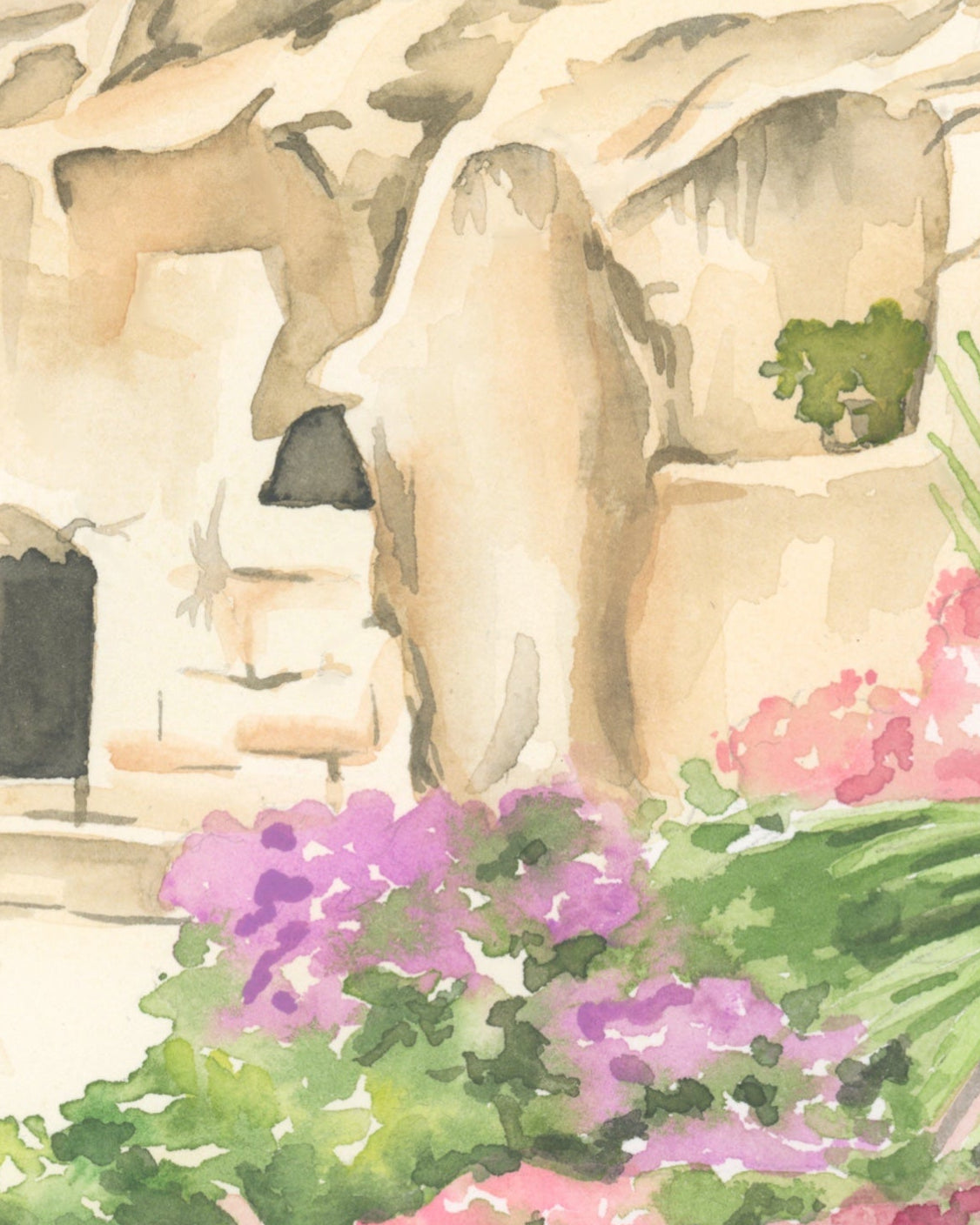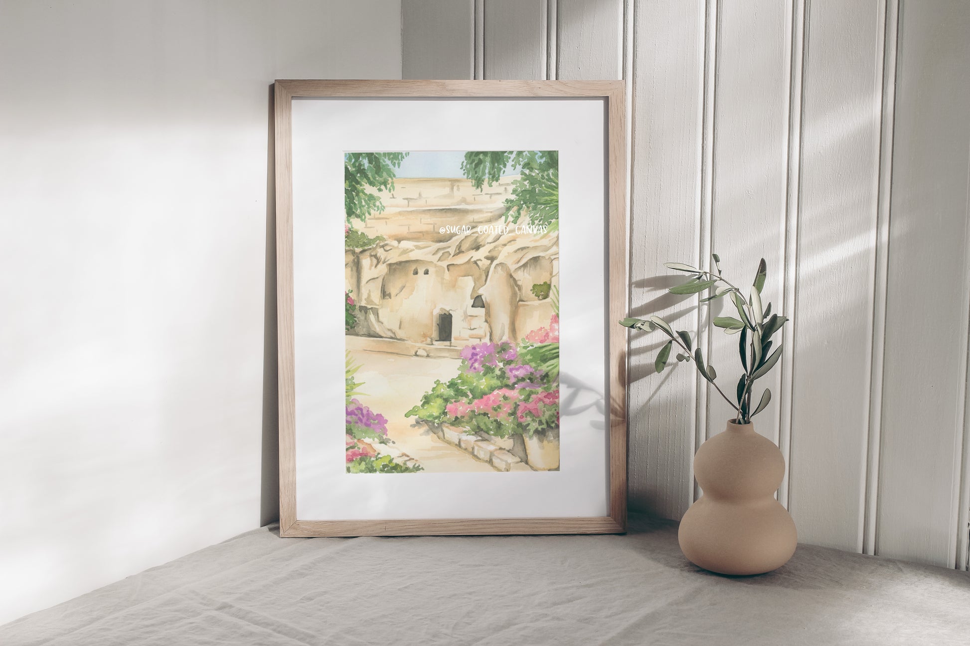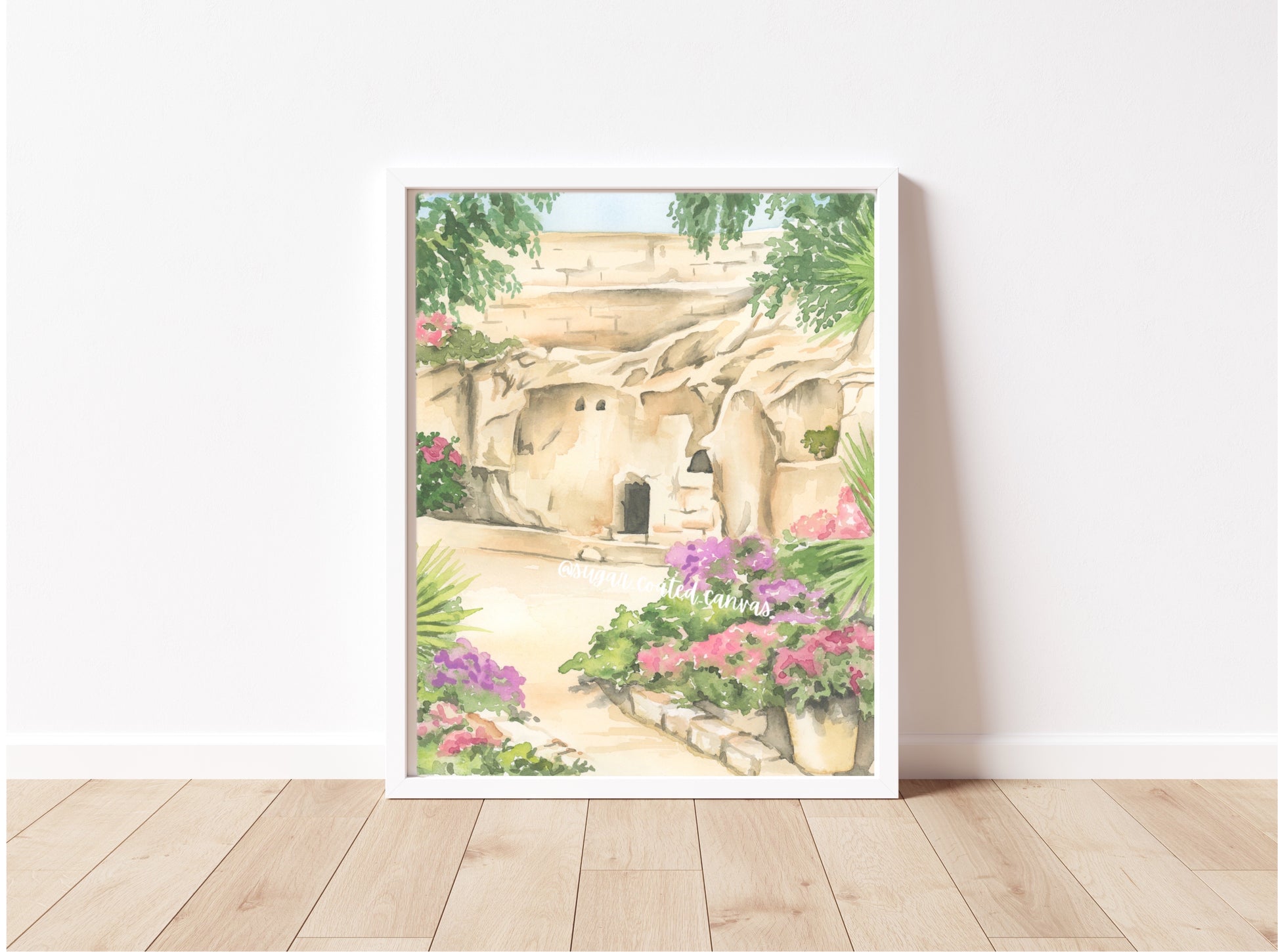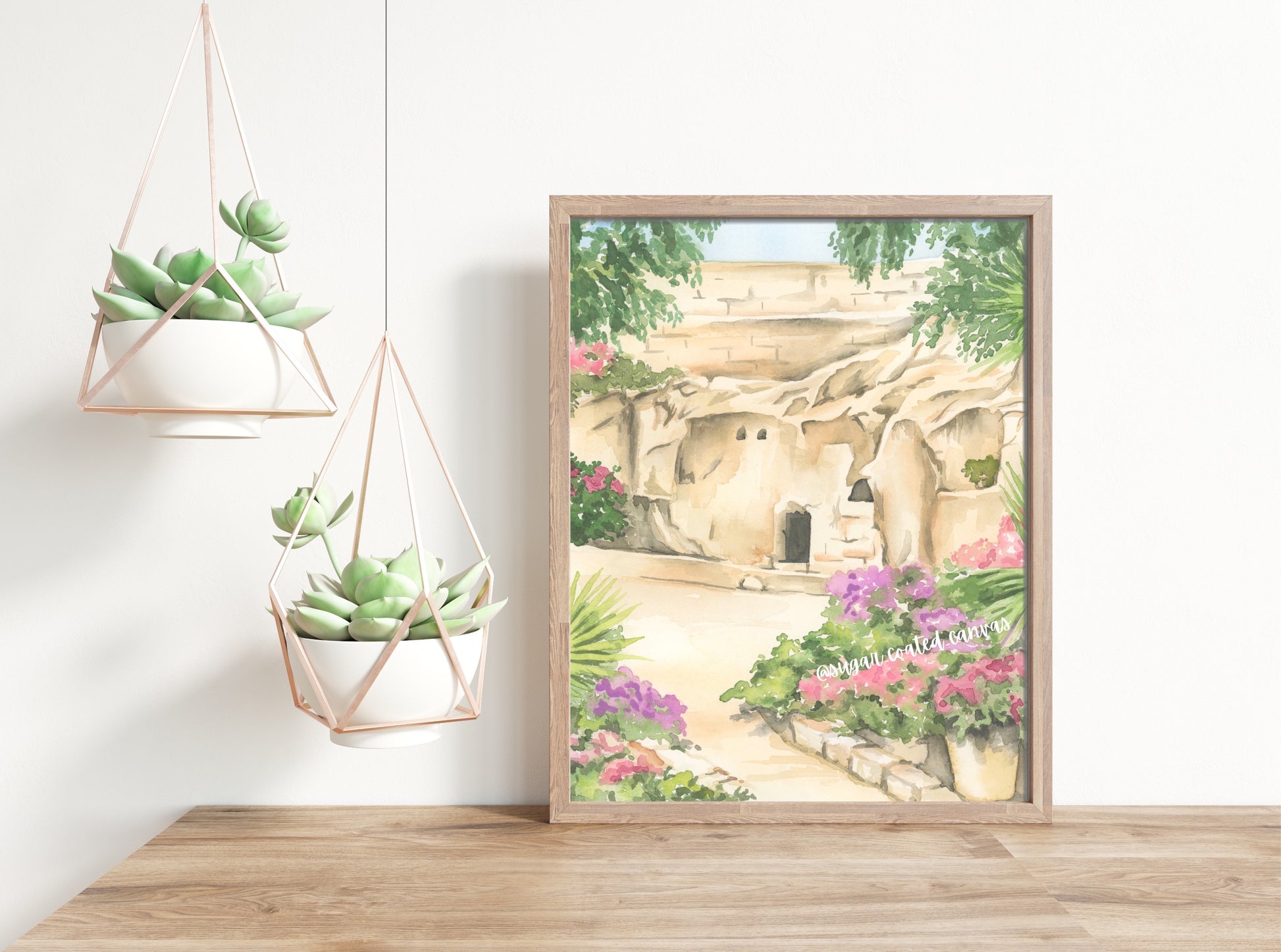 Add a touch of beauty to your home with a print of this hand painted watercolor of the Garden Tomb, a symbol of Easter and Christianity. This unique piece will bring a sense of peace and spirituality to any room, making it the perfect addition to your Easter decor.