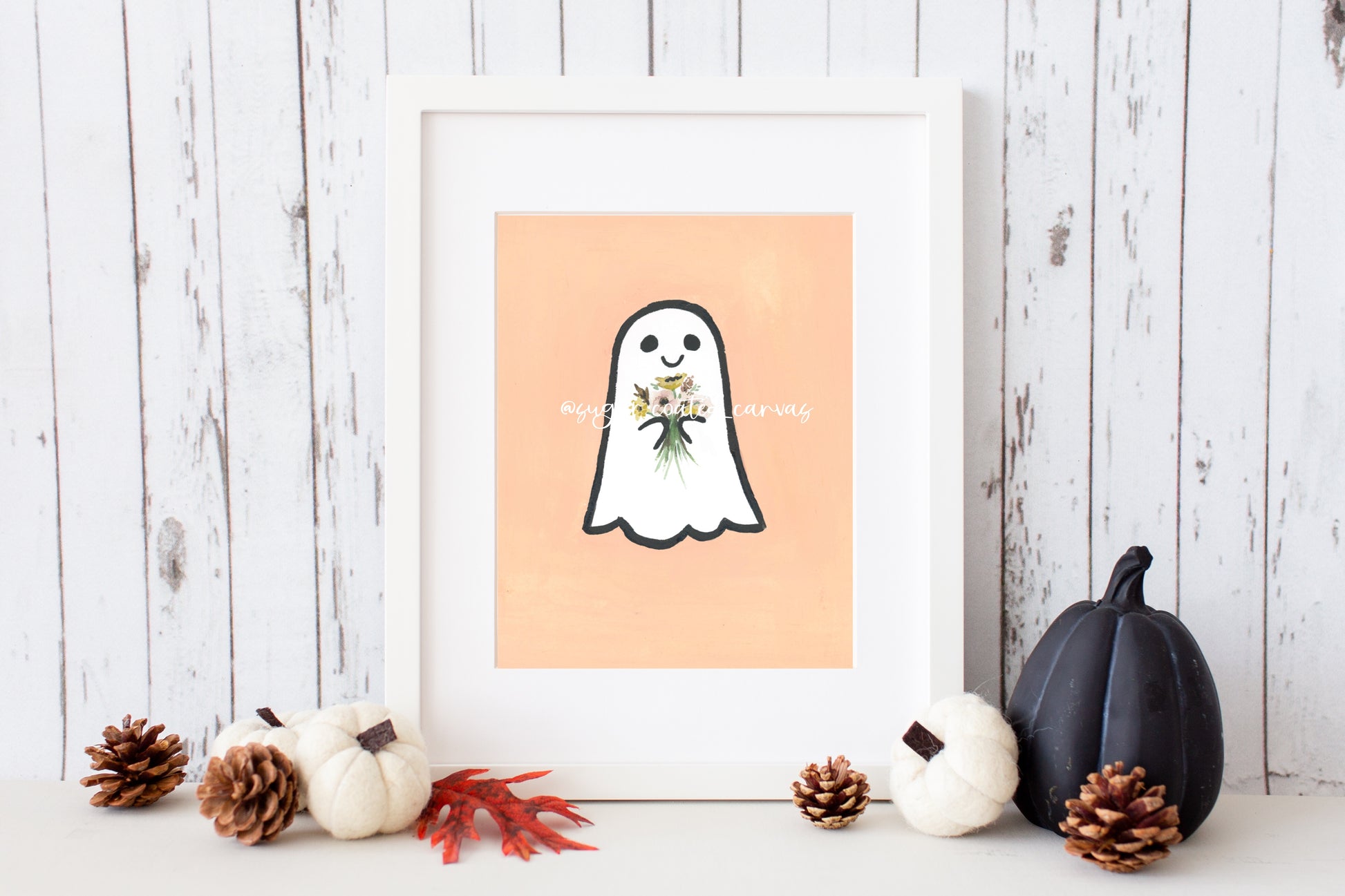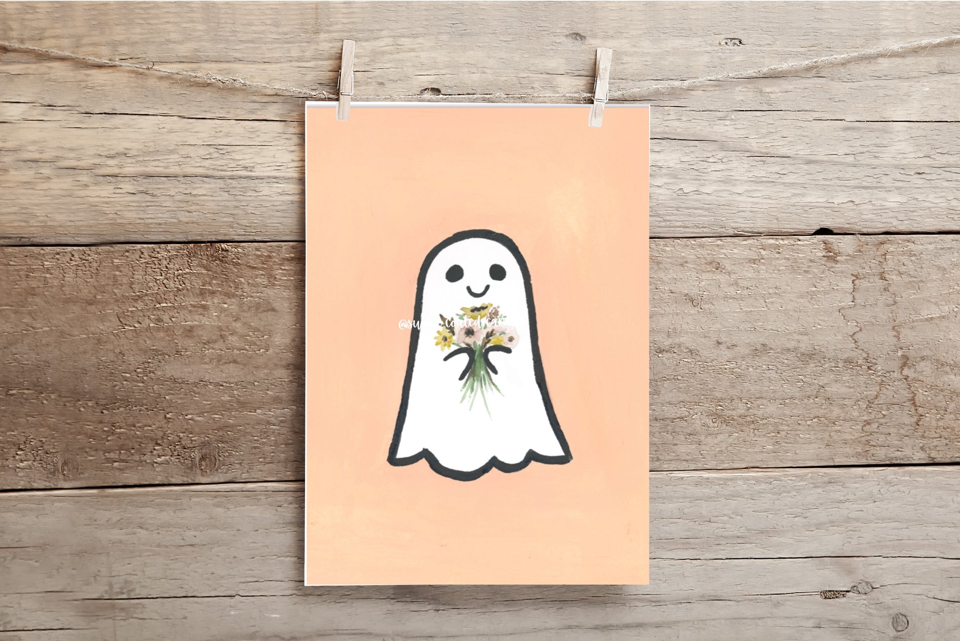 This charming print features a cute ghost holding flowers, beautifully depicted in watercolor and gauche. Perfect for adding a touch of fall or Halloween spirit to any home decor collection.