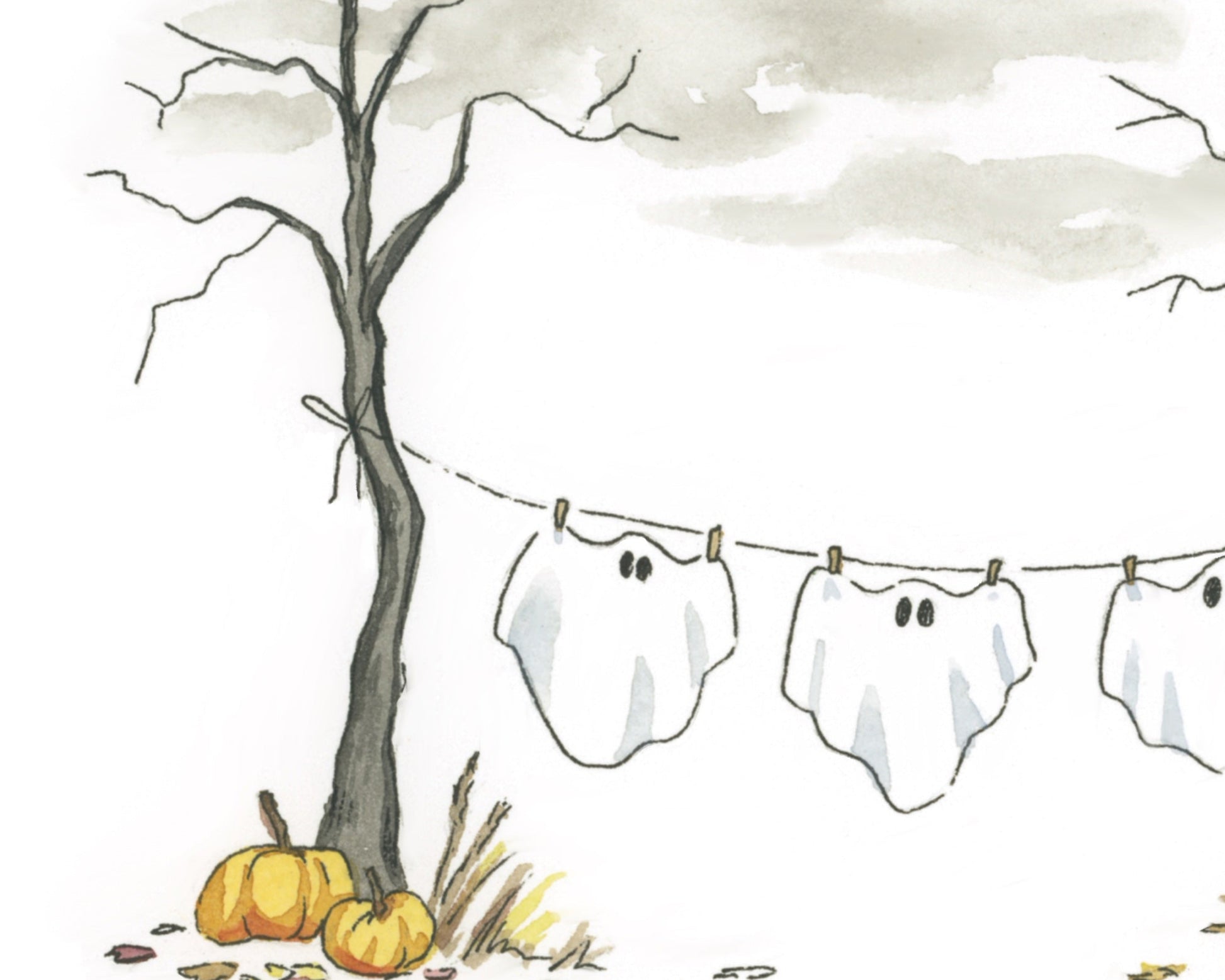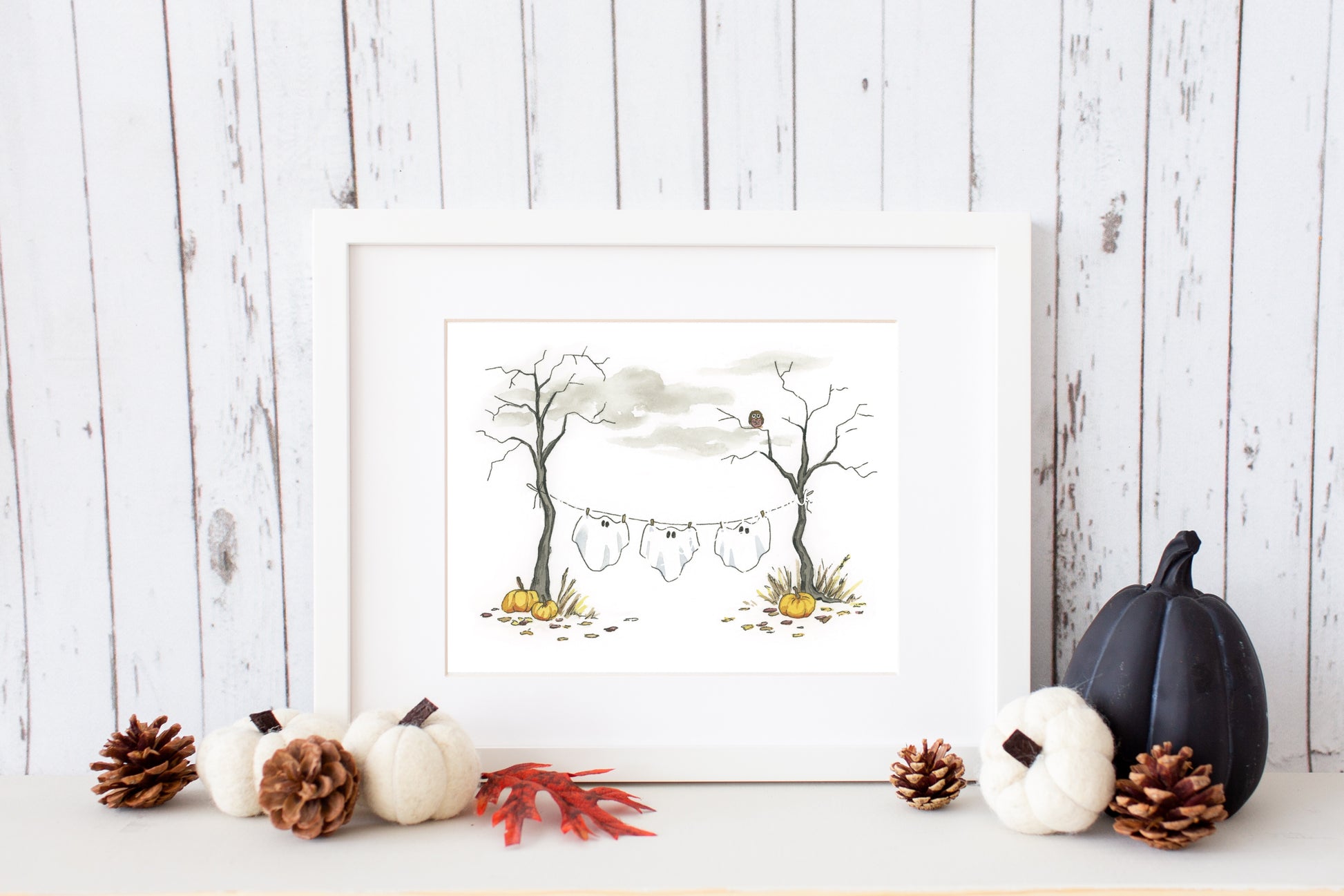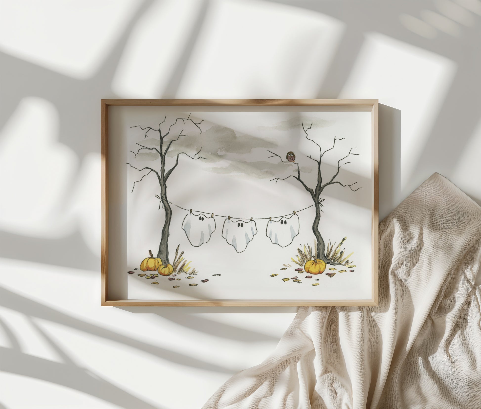 Capture the charm of autumn with "Ghosts Out to Dry," a playful watercolor print depicting cute ghosts hanging on a clothesline. This delightful artwork blends soft colors and quirky spirit to bring a fun and festive touch to your home décor, making it perfect for Halloween or anytime you want a smile.