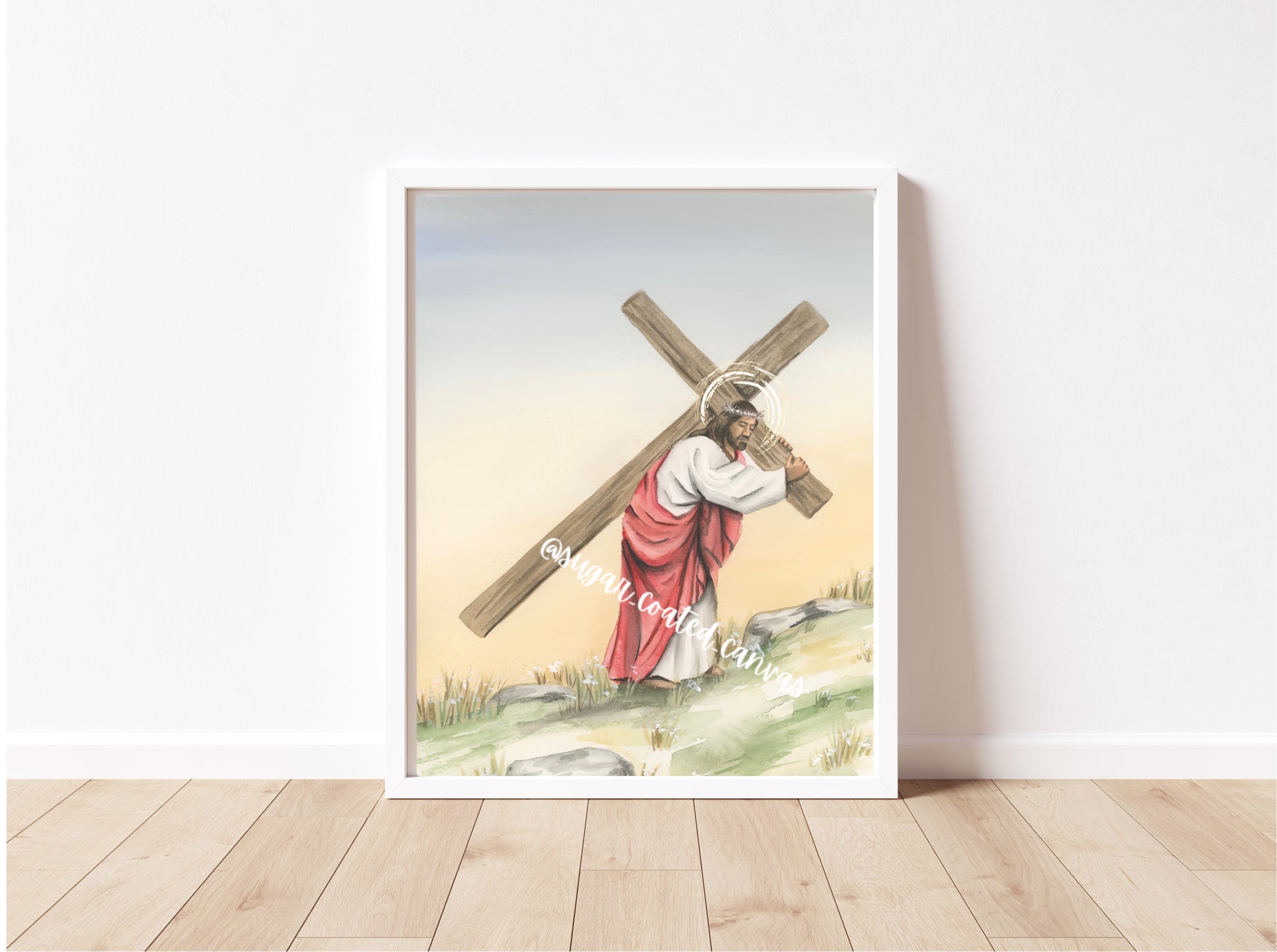 Celebrate the true meaning of Easter with this stunning Good Friday Watercolor Print. Depicting Jesus Christ carrying the cross, this print is perfect for adding a touch of spirituality to your home decor. Embrace the spirit of Holy Week and bring a sense of peace and purpose into your space.