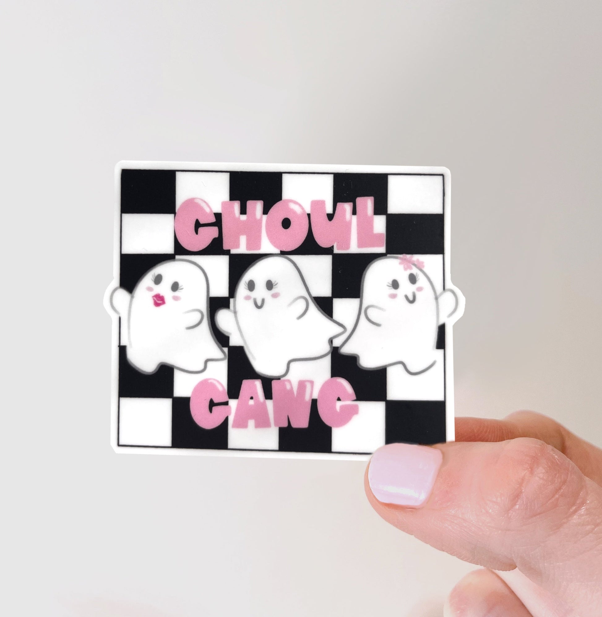 Join the cute little Goul Gang with this playful sticker featuring girly ghosts and a fun checkered pattern. Perfect for adding a spooky yet stylish touch to your favorite items, this sticker brings a charming vibe to your collection. Durable and delightful, it’s a must-have for ghostly fun!