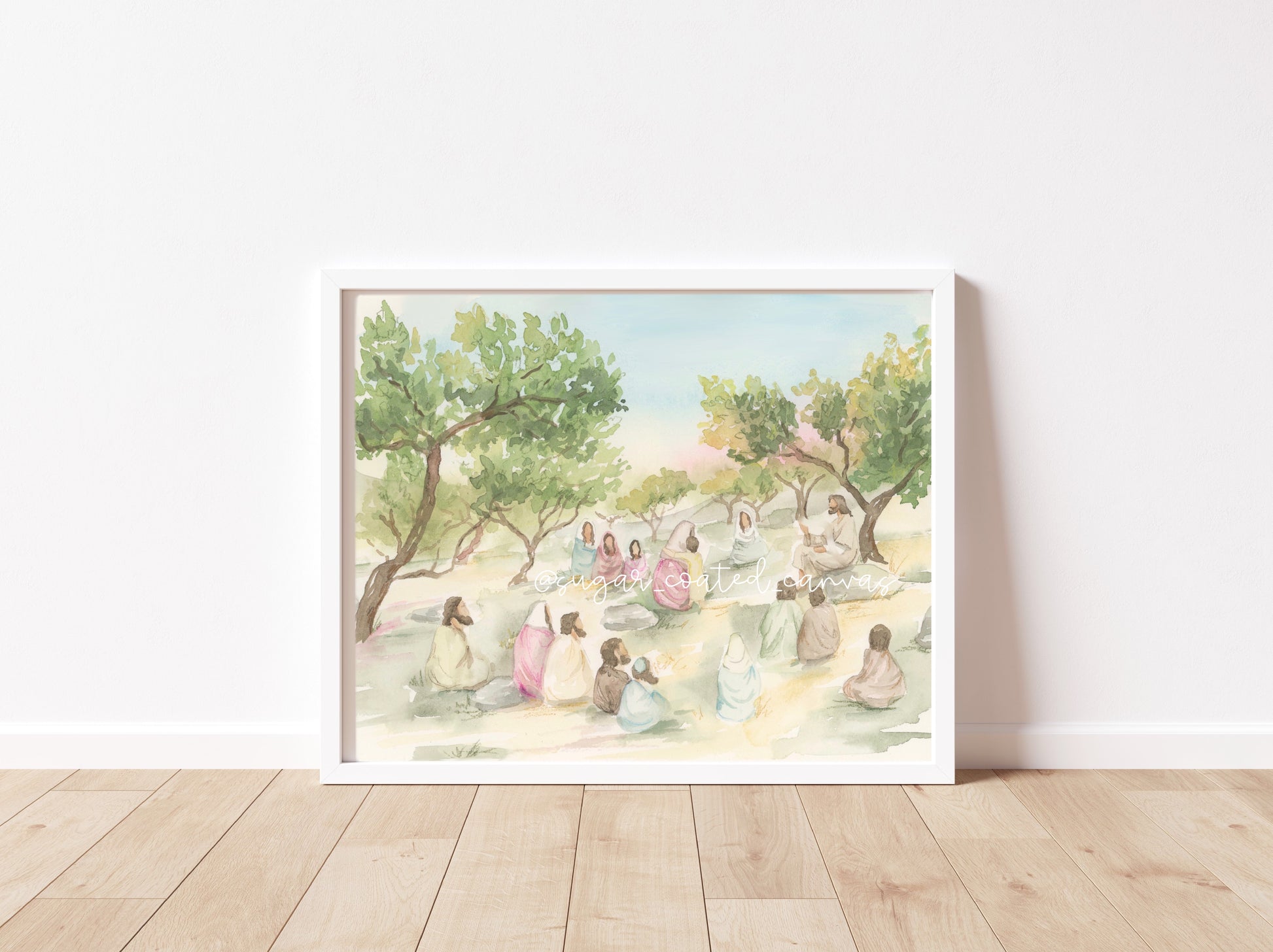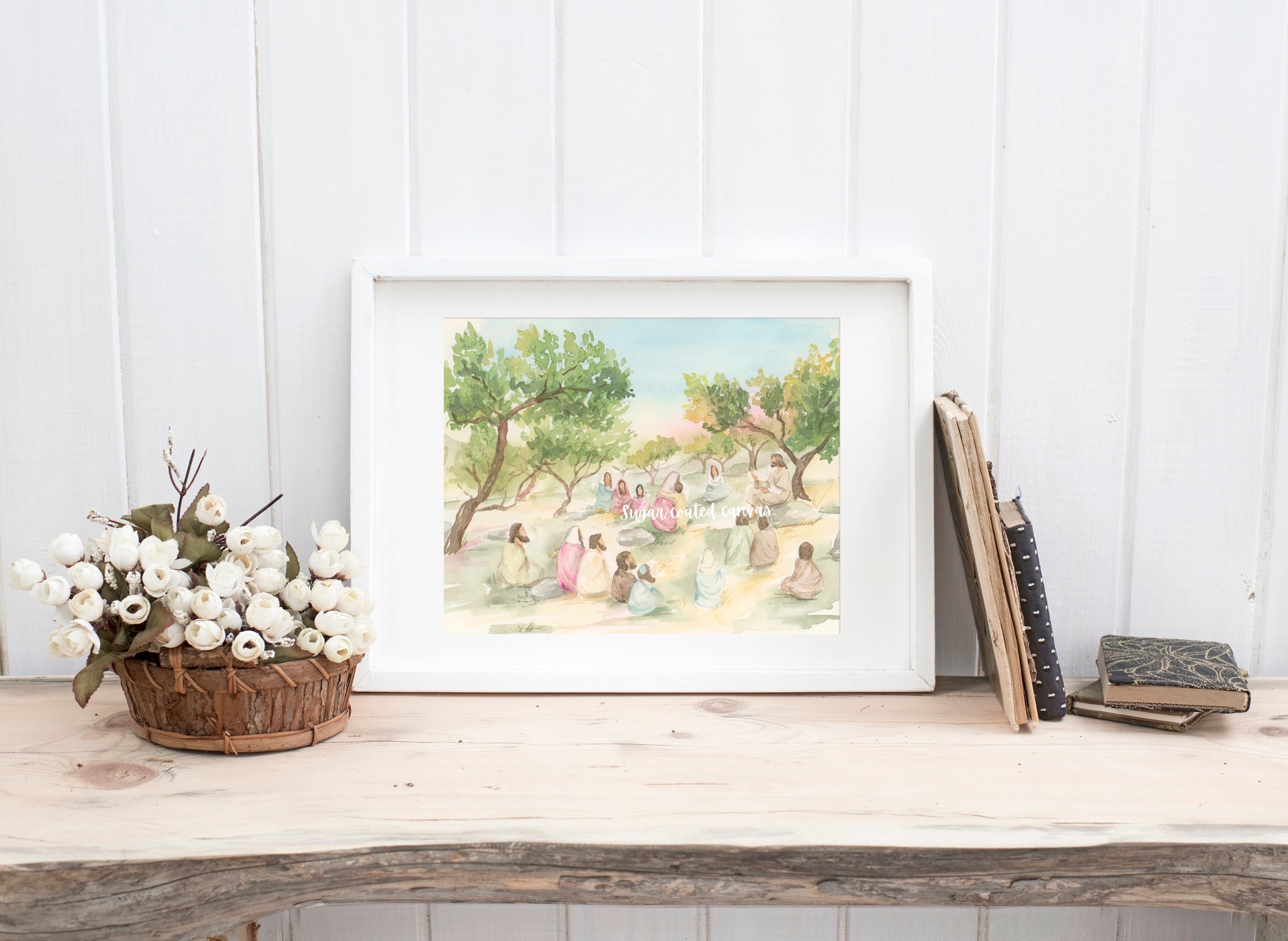 Experience the beauty and serenity of the Mount of Olives with this mixed media piece. As you gaze upon Jesus Christ teaching on this holy mount, feel His perfect love and find inspiration in His teachings. Perfect for missionaries or anyone seeking a constant reminder of faith and love.