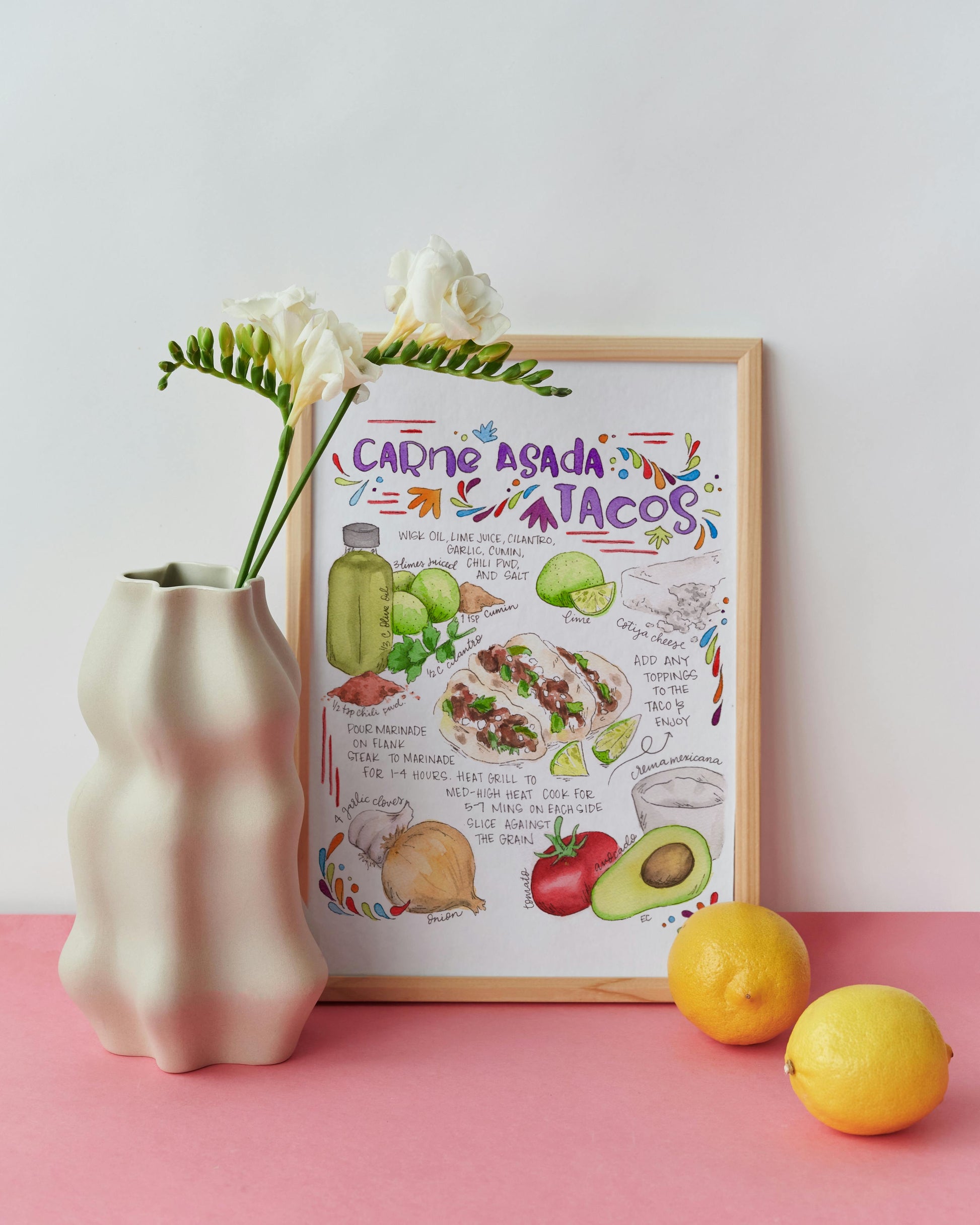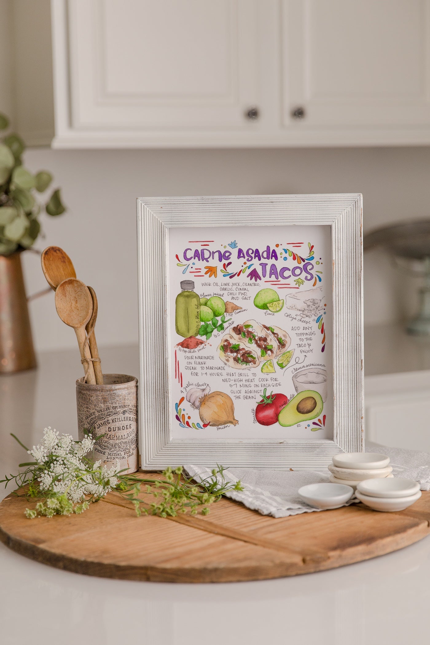 Elevate your kitchen decor with our Illustrated Taco Recipe - a perfect combination of color and fun! This unique art piece is a must-have for any taco lover. Let our recipe guide you to delicious and satisfying meals.