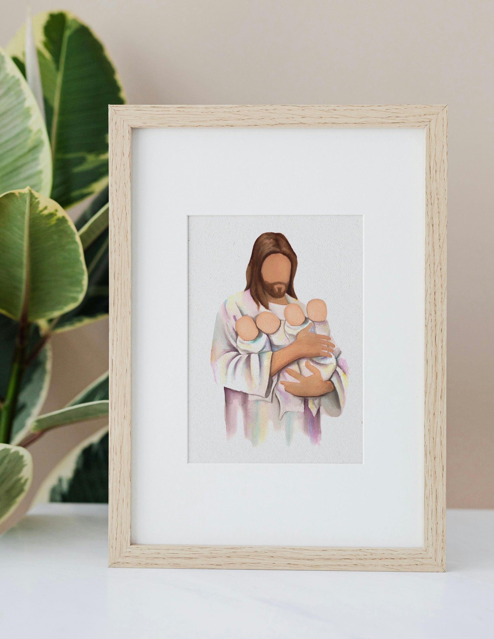 Need a comforting gift for someone who has experienced a miscarriage or wants to honor their angel babies? Look no further than our beautiful watercolor print of Jesus holding four babies. This touching piece of art is a reminder of love and comfort, and a way to hold on to precious memories.