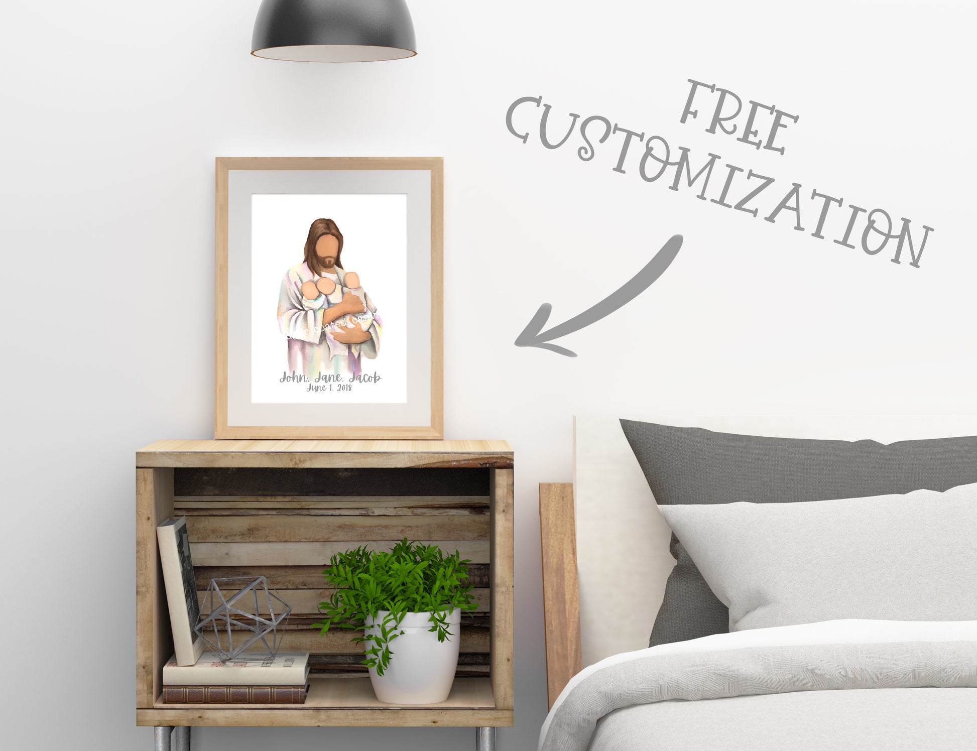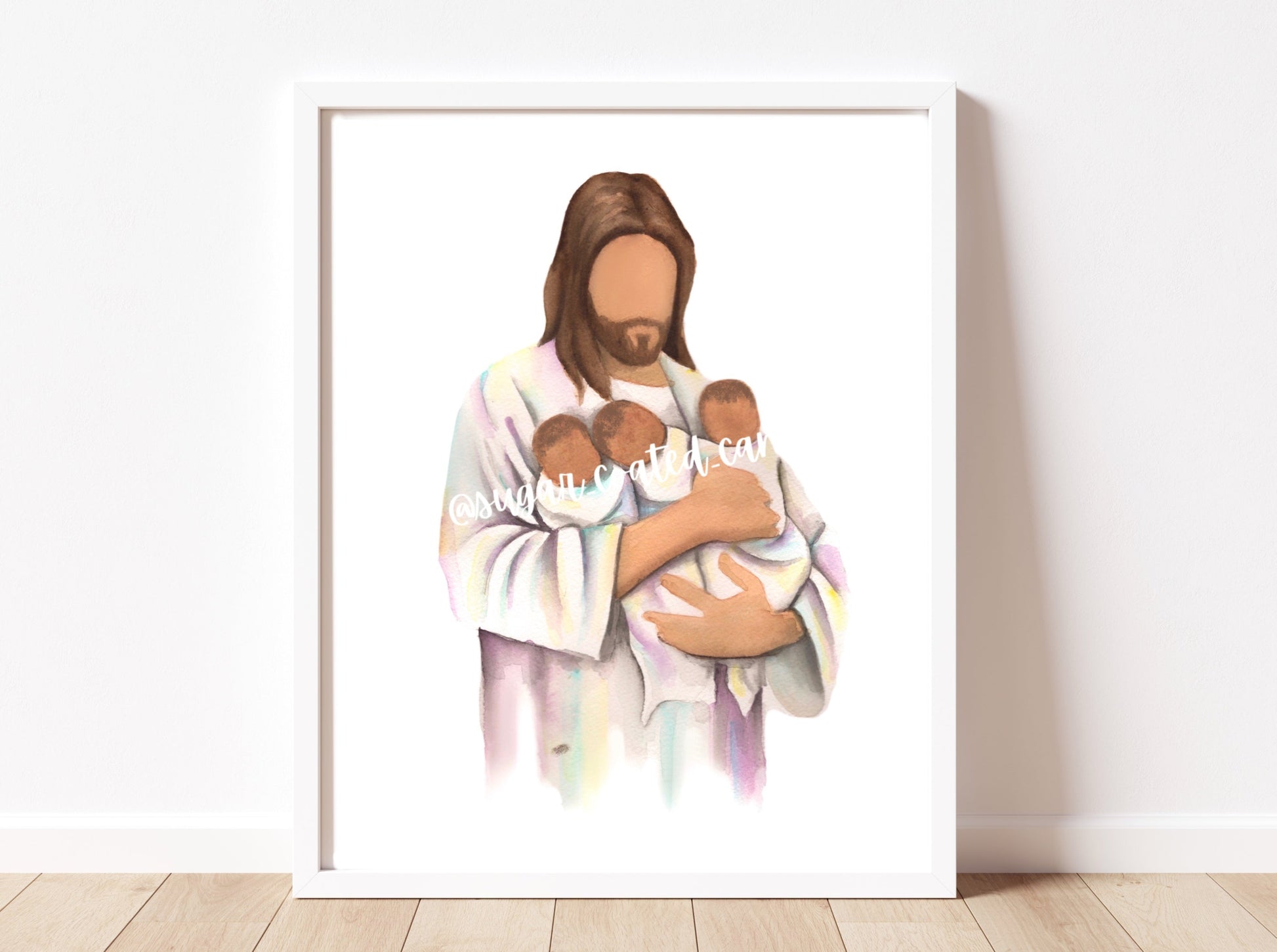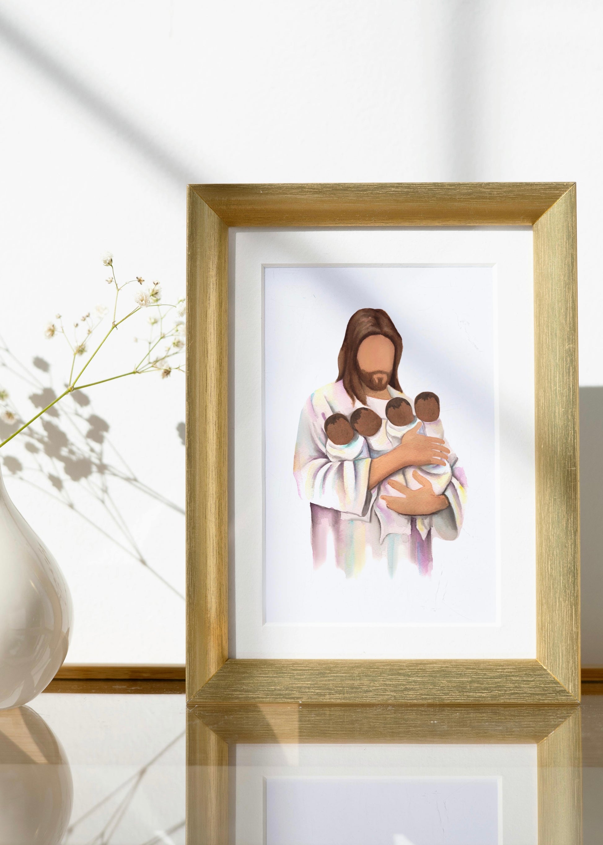 Need a comforting gift for someone who has experienced a miscarriage or wants to honor their angel babies? Look no further than our beautiful watercolor print of Jesus holding four babies. This touching piece of art is a reminder of love and comfort, and a way to hold on to precious memories.