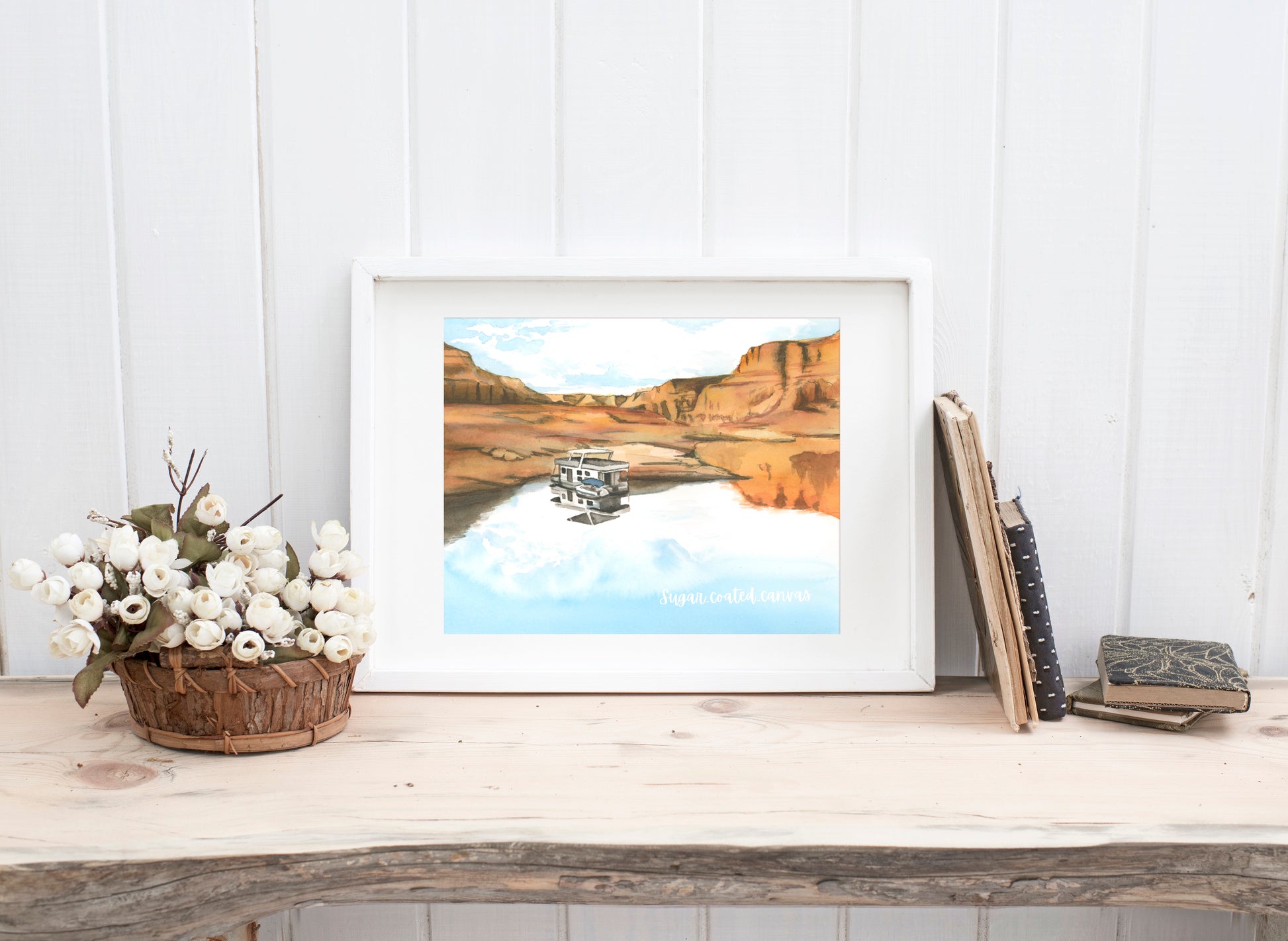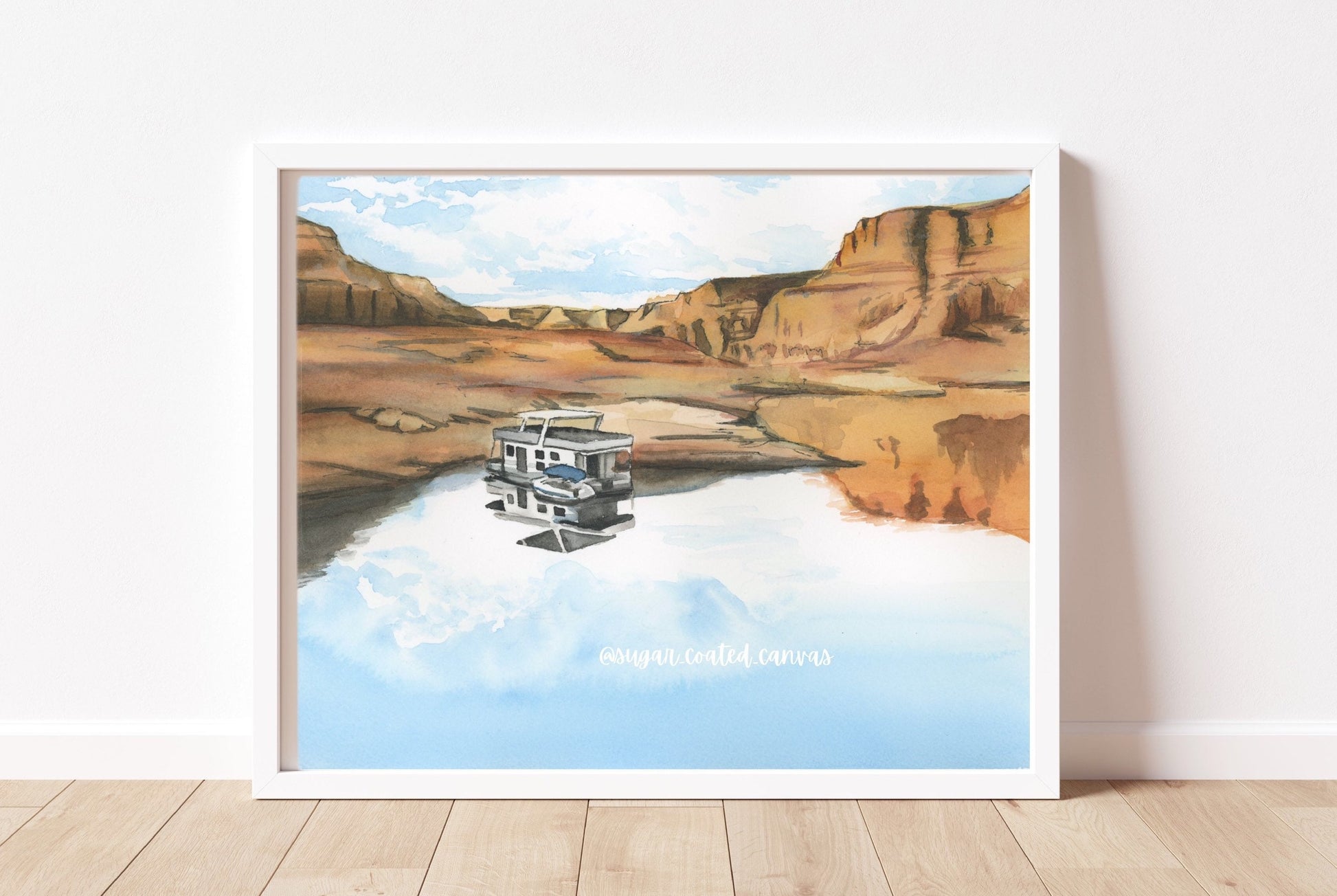 This beautiful watercolor print captures the essence of summer at Lake Powell. Hang it in your home and let it transport you to a place of relaxation and fun on the lake. Perfect for those who love Lake Powell.