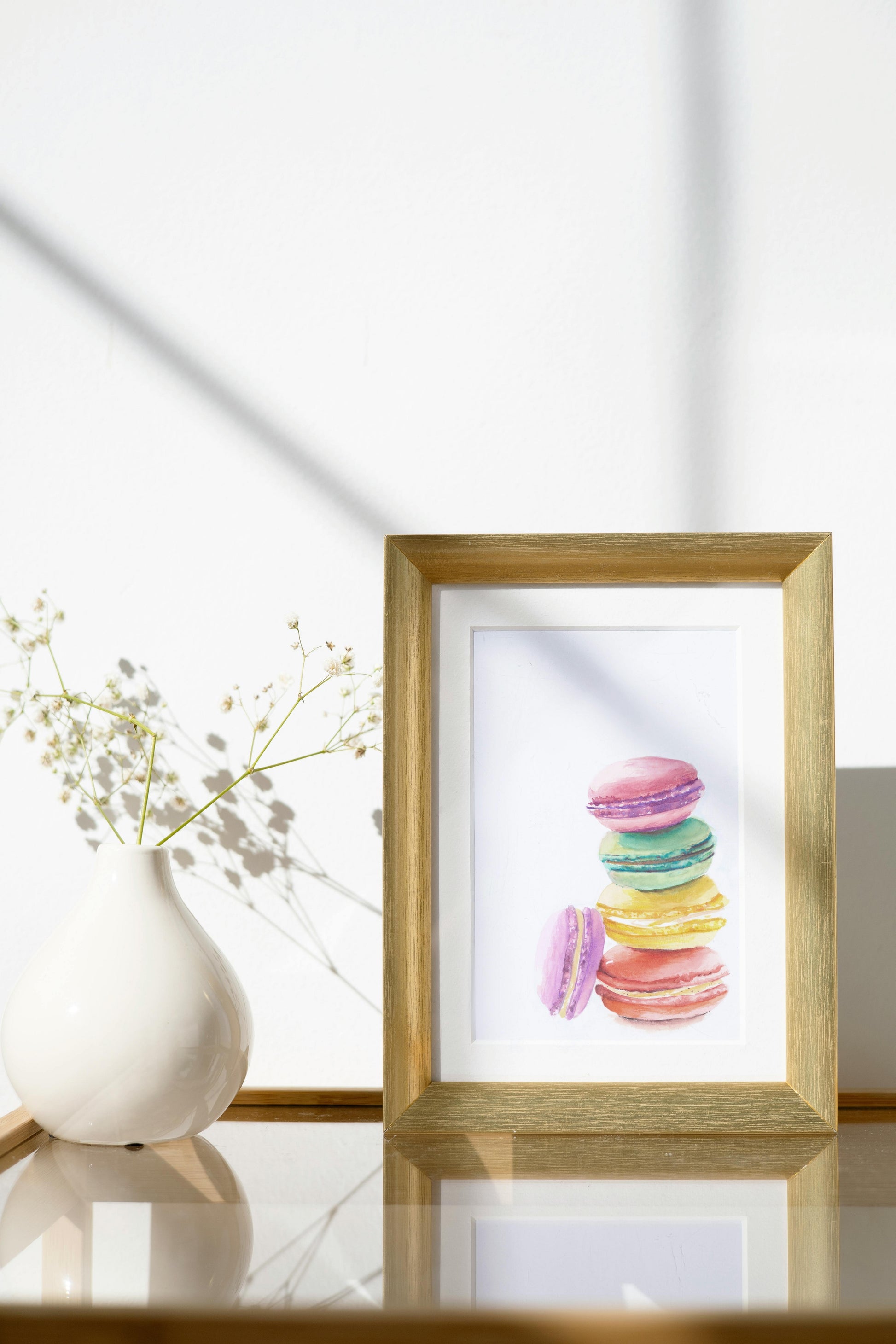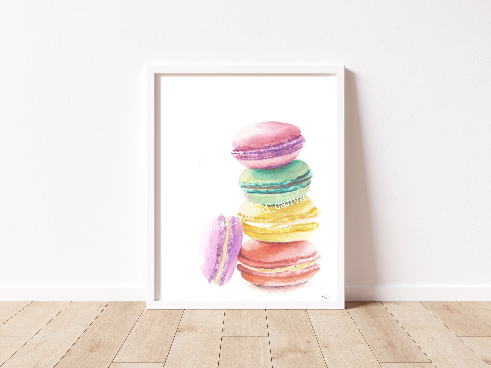 Bring the delicate beauty of French patisserie to your walls with this vibrant watercolor painting of macarons. Each brushstroke captures the colorful array of these delightful confections, creating a cheerful focal point for your kitchen, dining area, or any space that could use a sweet touch of artistry. Perfect for dessert lovers and art enthusiasts alike.