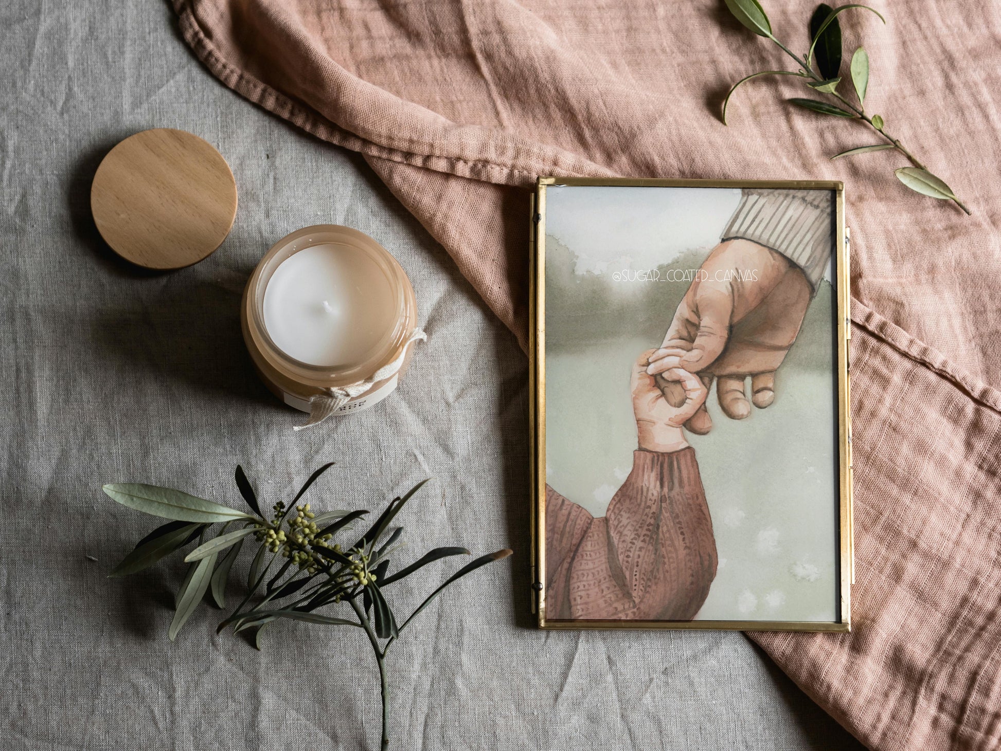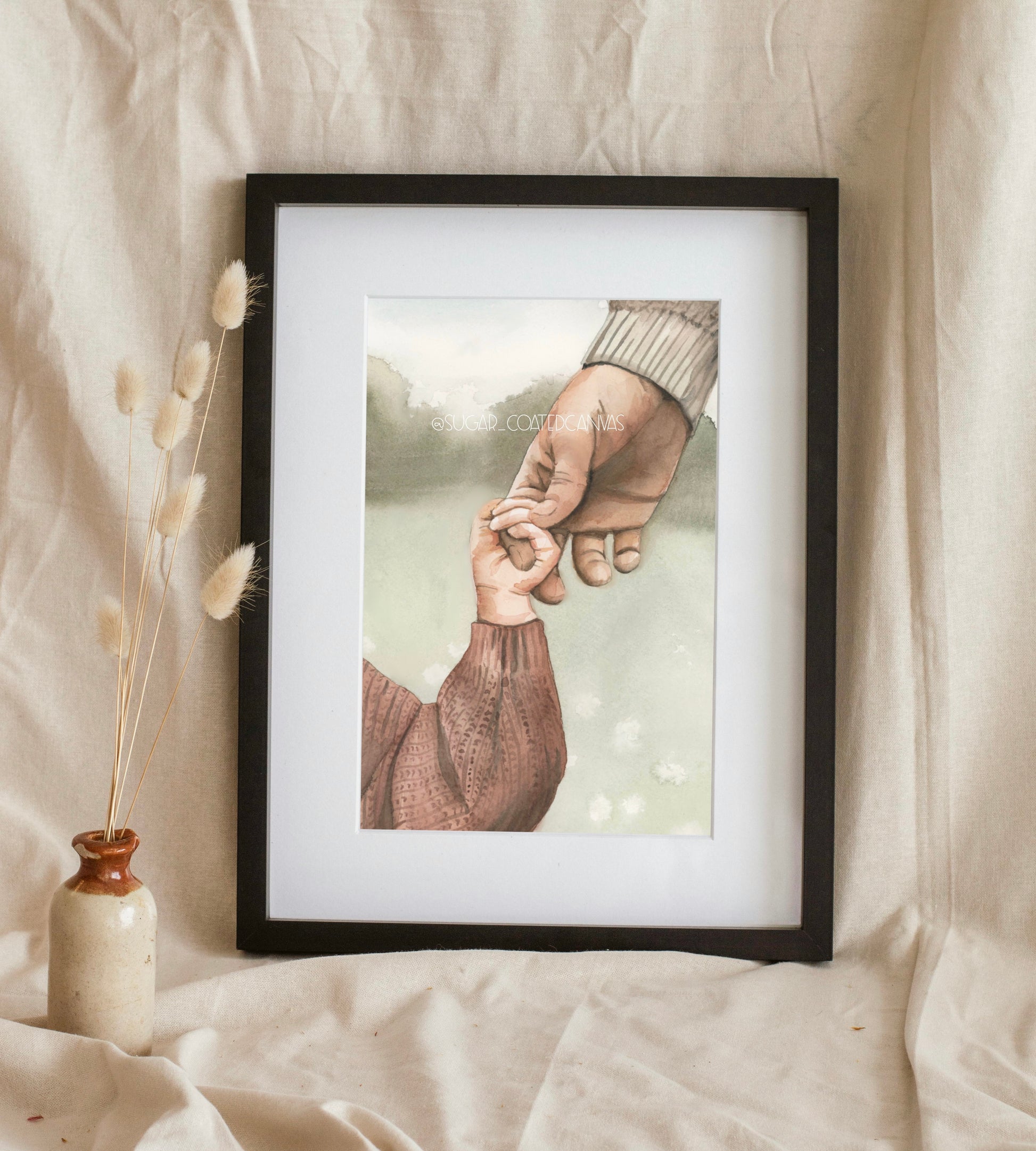 Capture the bond of motherhood with Momma's Hand watercolor Print. This stunning artwork portrays a little one holding their mom's hand in a beautiful watercolor style. The perfect gift for Mother's Day, this print celebrates the unconditional love between a mother and child.