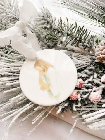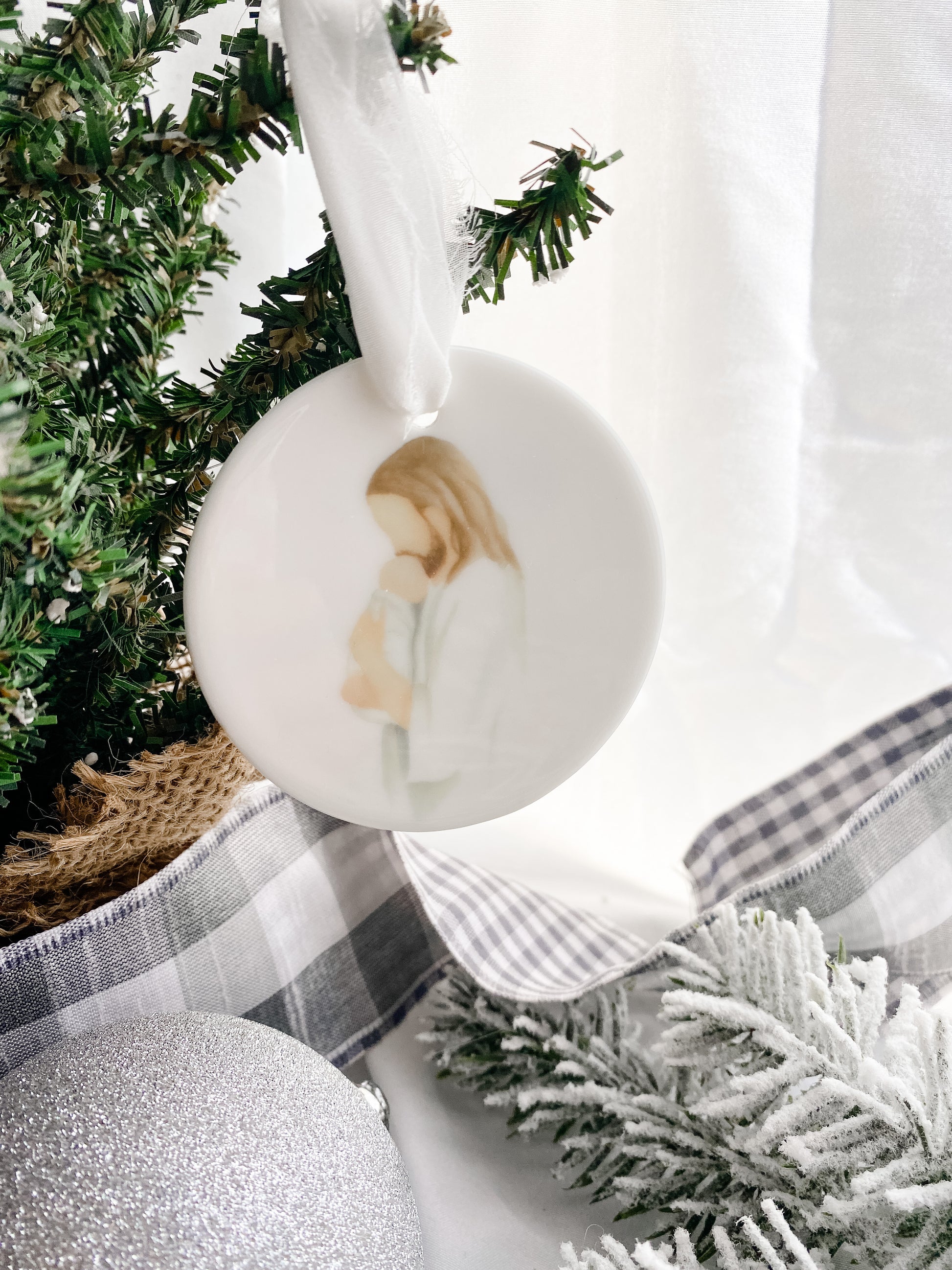 Honor your little one with this elegant Jesus holding baby ornament. A meaningful way to remember and cherish your precious angel during the holiday season. Perfect gift for any grieving family.