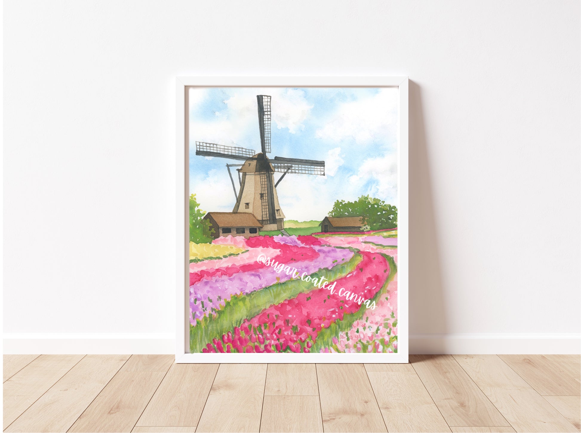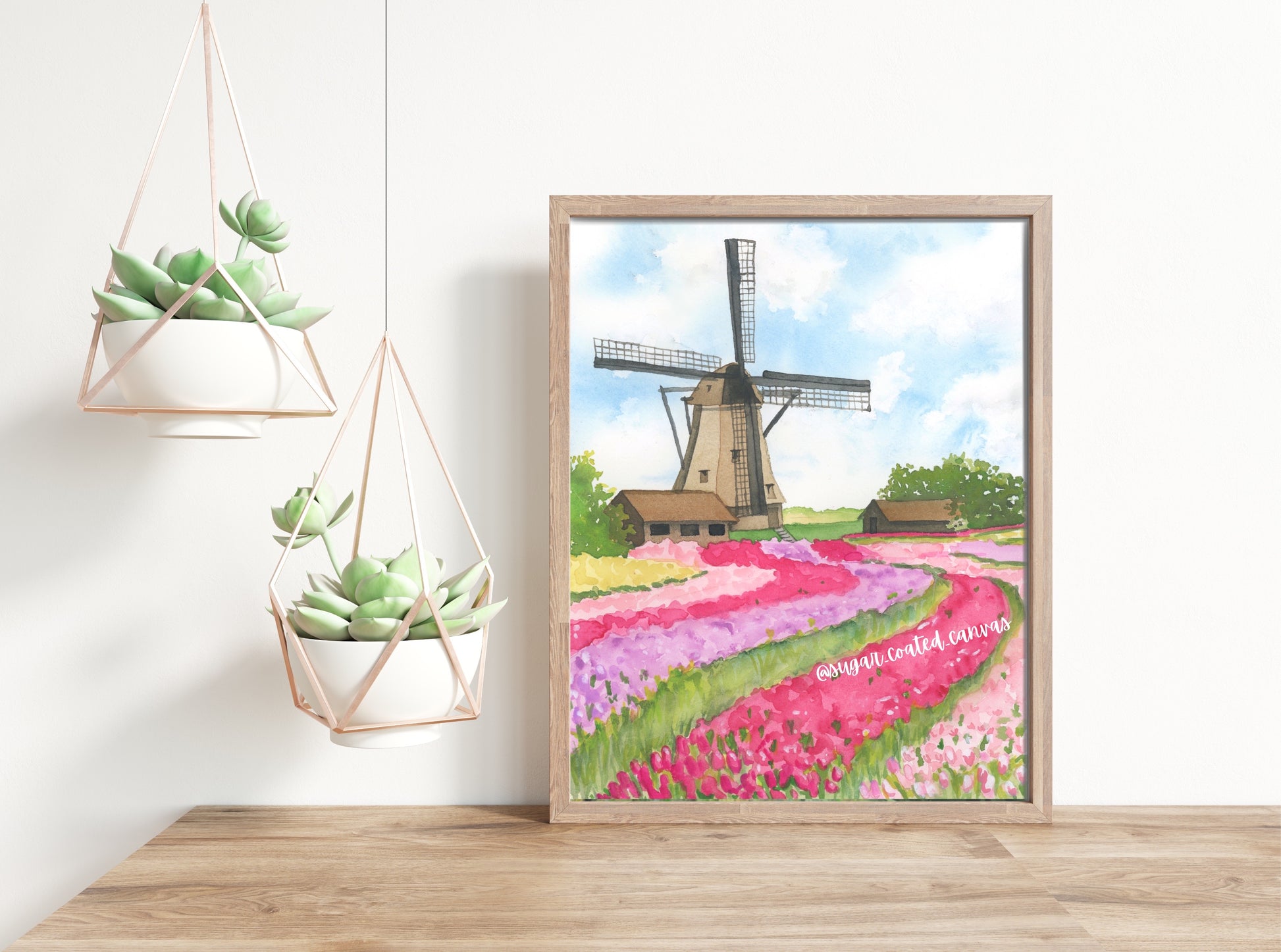 Experience the beauty of Holland with this stunning watercolor print. Featuring vibrant tulip fields, this print is perfect for travel lovers and those who appreciate the simple beauty of nature. Add a touch of Holland to your home with this beautiful piece.