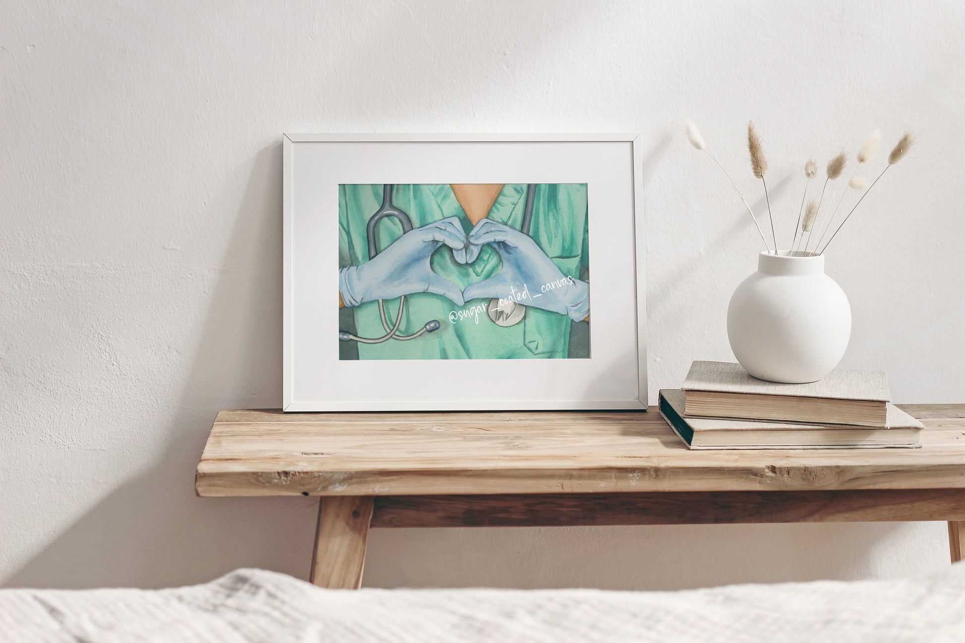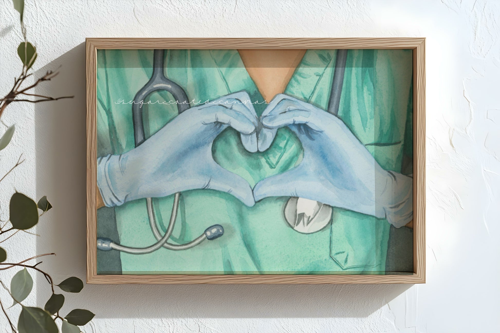 Celebrate the dedication and compassion of healthcare professionals with this beautiful watercolor print. Featuring a nurse or doctor holding their hands in the shape of a heart, this print is the perfect gift to show appreciation and gratitude. Form and function come together in this stunning piece.