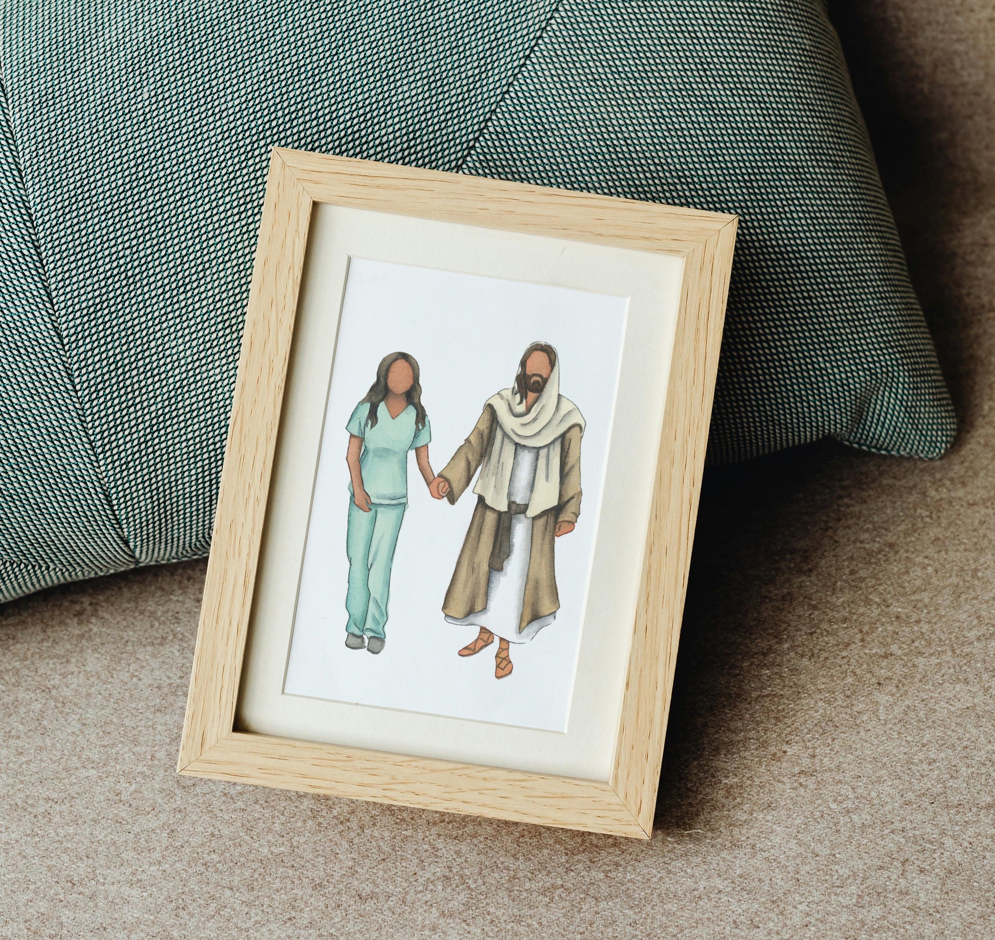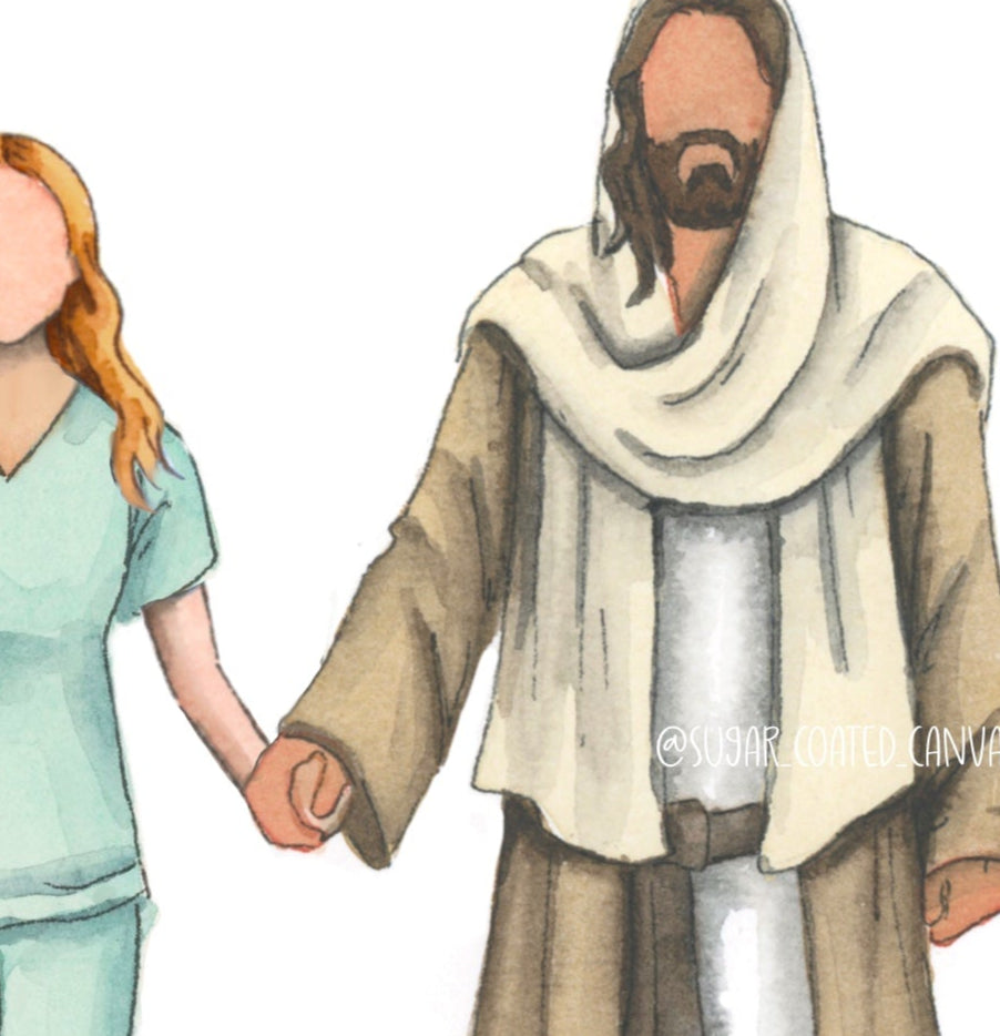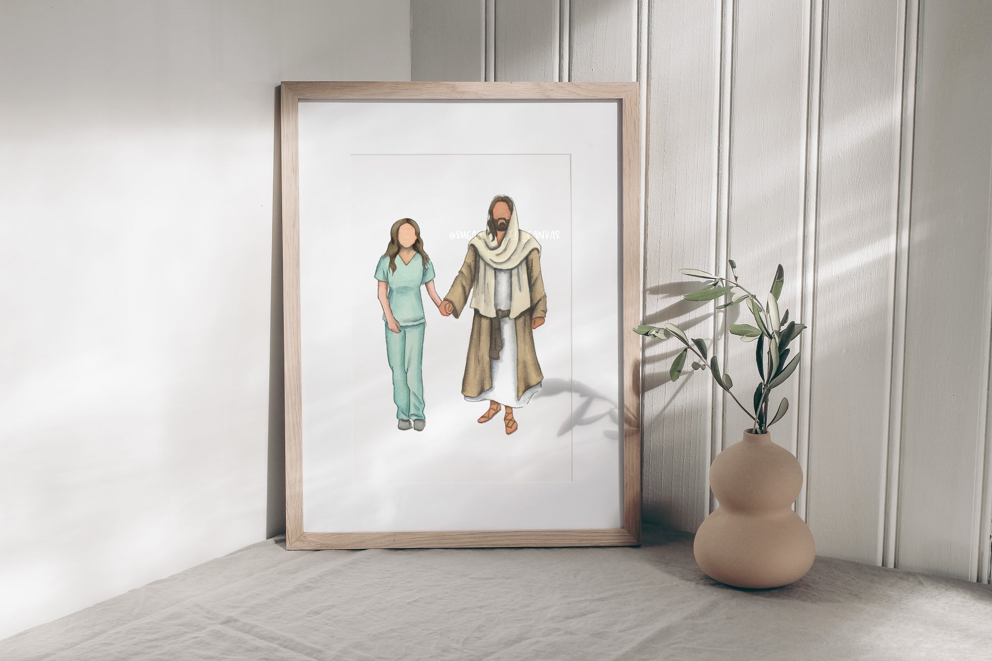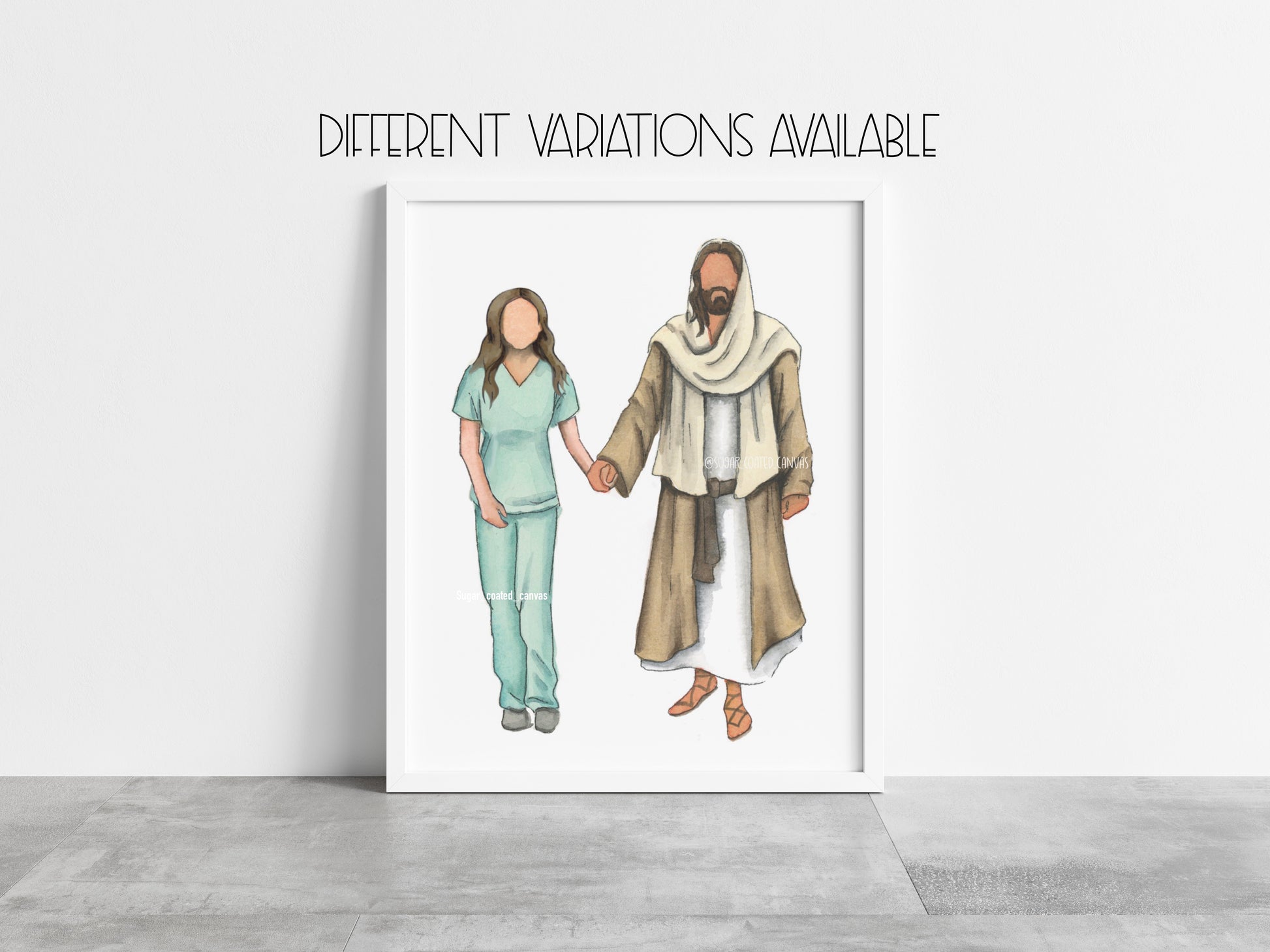 This Nurse Walking with Christ Watercolor Print is the perfect meaningful and comforting gift for any nurse. The beautifully rendered artwork depicts a nurse walking with Jesus, reminding them of their faith and purpose in their profession. Show your support and appreciation with this unique and thoughtful present.
