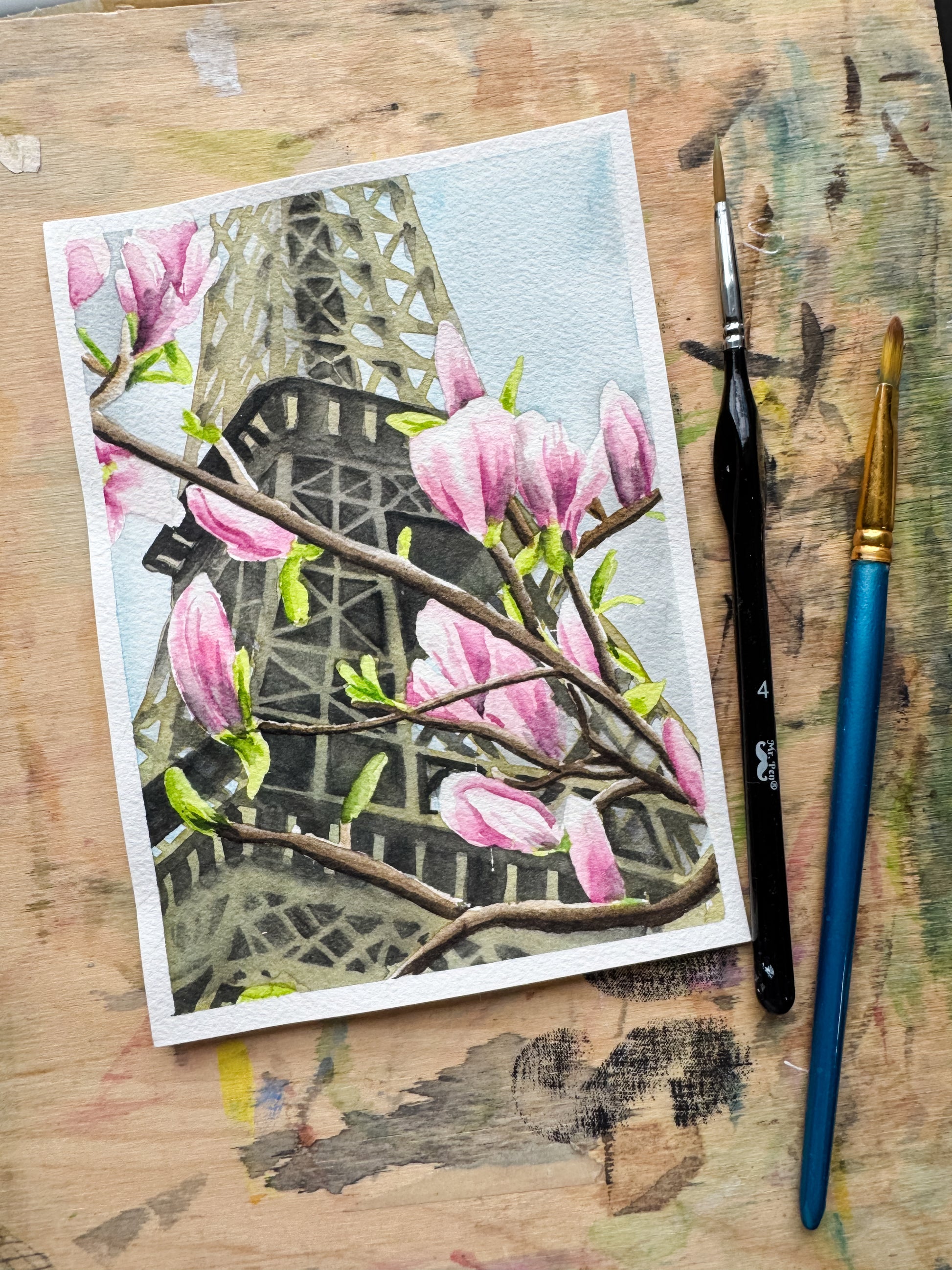 This is a hand painted watercolor painting of the Eiffel tower. Painted from a photograph from my trip to Paris in the spring which was magical. I hope this piece will bring someone joy, like it does for me. This is an original 5x7inch watercolor painting.