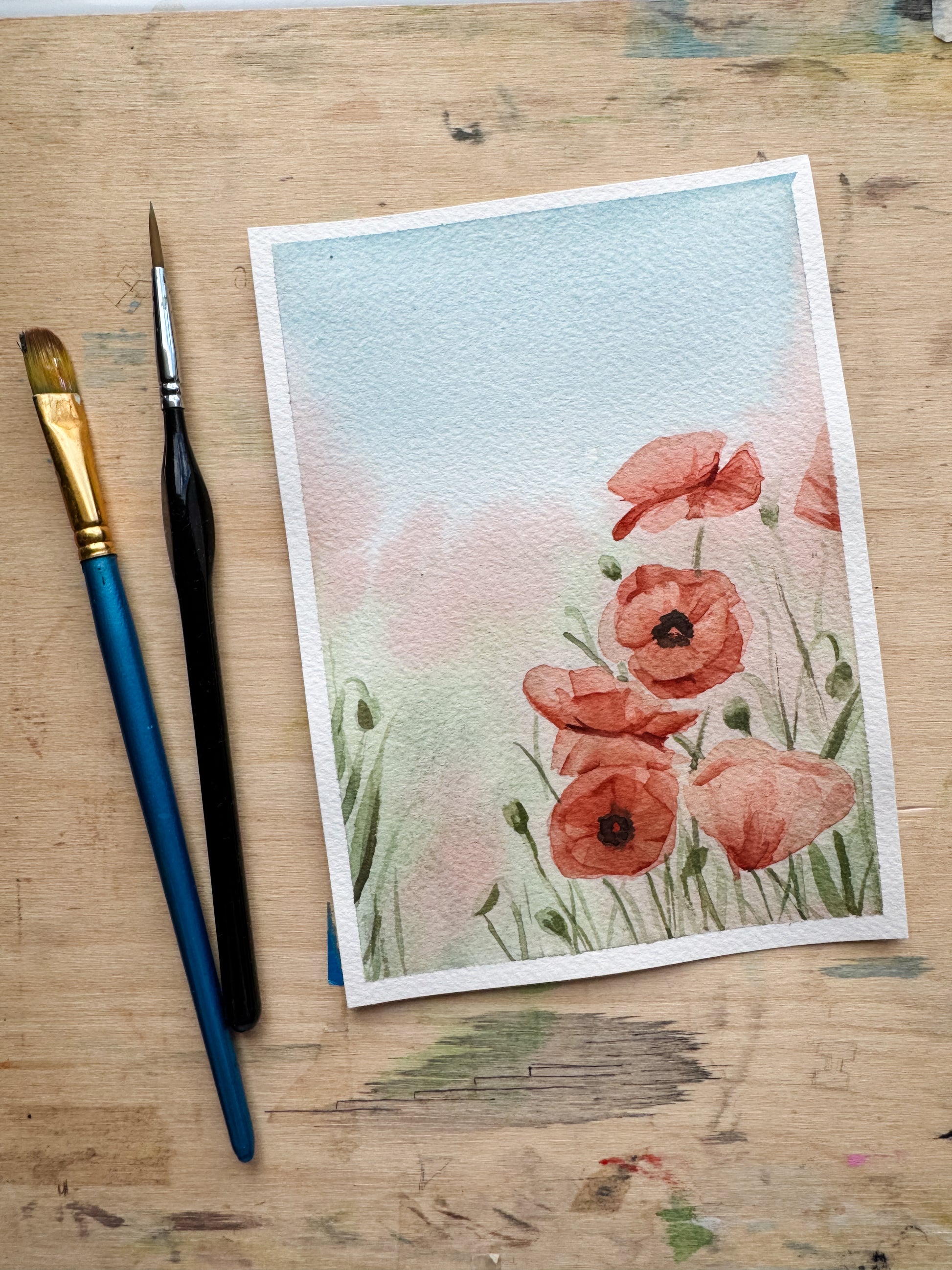 This piece is a 5x7 Hand painted watercolor painting of poppies.