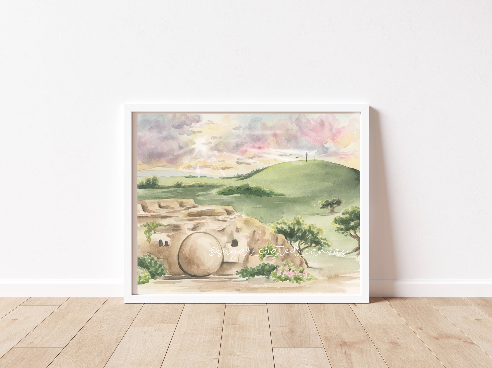 Celebrate the hope and promise of Easter with our Sunday Will Come Watercolor Print. Featuring a beautiful garden tomb with crosses, this Christian artwork reminds us that no matter what challenges may come, Sunday will always come with a message of redemption and renewal. Hang it in your home or gift it to a loved one for a reminder of faith and perseverance.