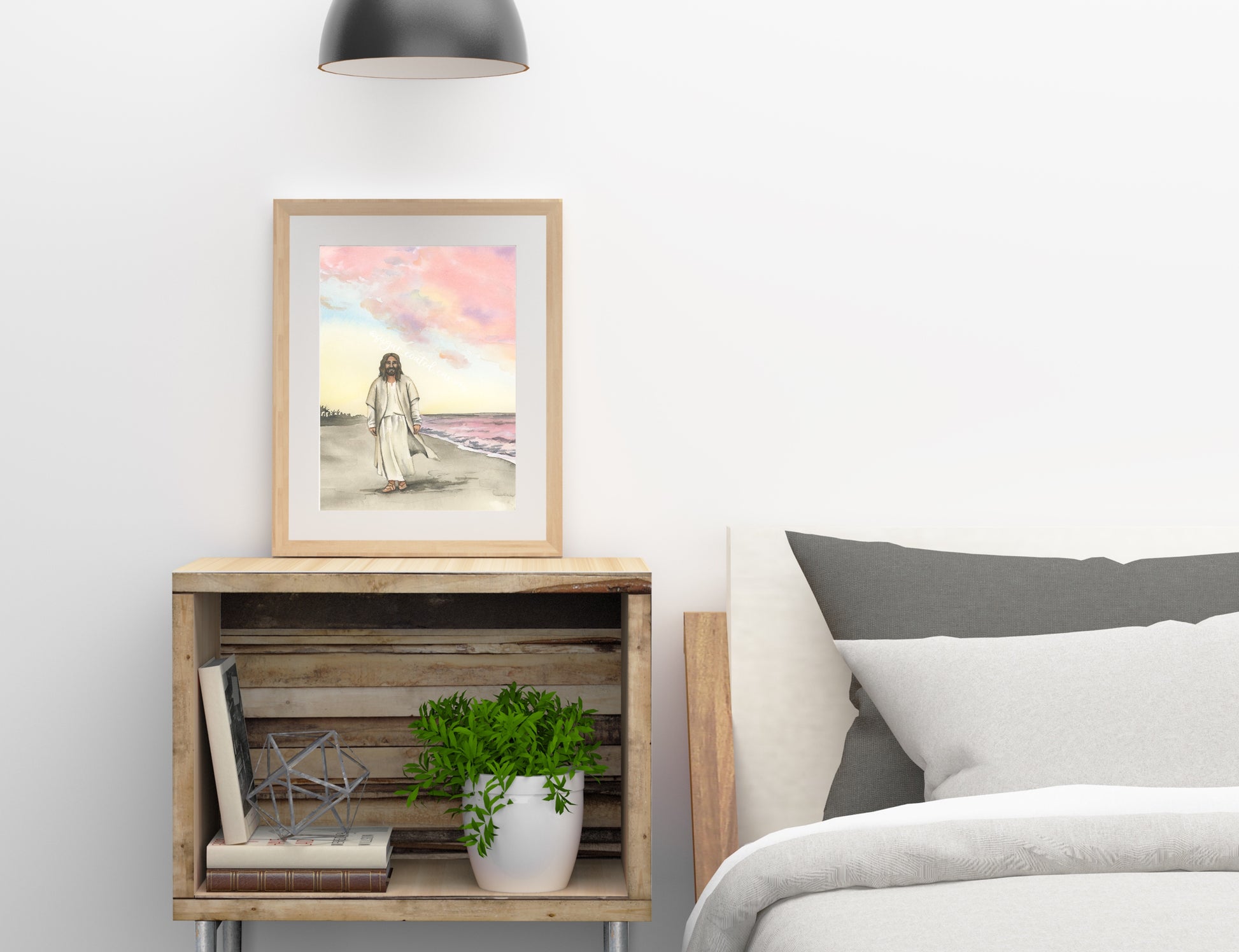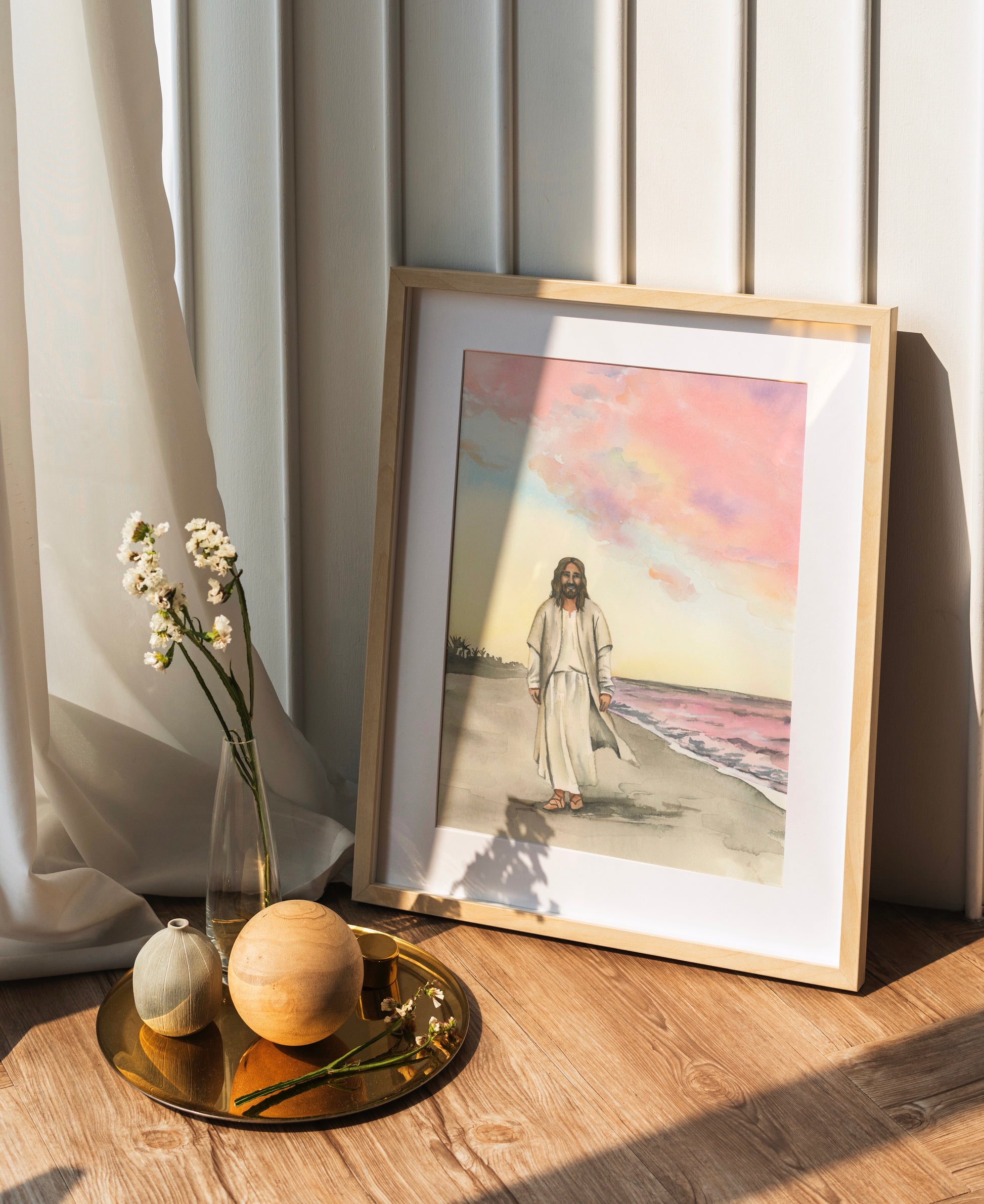Add a touch of serenity and spirituality to your space with this beautiful watercolor featuring a beach sunset and Jesus Christ. Perfect for any Christian or anyone looking to add a peaceful and meaningful touch. The perfect addition to any home decor.