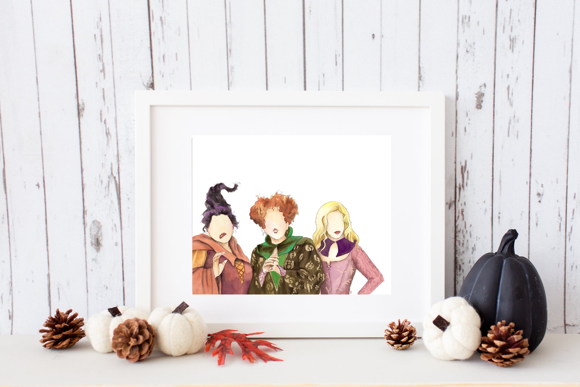 Celebrate spooky fun with this playful watercolor print featuring the iconic Sanderson Sisters. Their whimsical charm and vibrant colors bring a touch of magic and mischief to any room, perfect for fans of classic witchy tales.